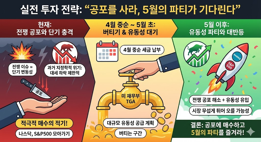 역사적으로 전쟁 이슈는 단기적 변동성을 줄 뿐 오래가지 못함. 따라서 하락 시 저가 매수의 기회로 삼아야. 미국은 4월 중순에 세금 납부. 이후 5월부터 미재무부가 TGA 잔고를 풀어 막대한 유동성 공급할 계획이며 과거 매파로 분류됐지만 트럼프가 임명한 차기 연준 의장 워시의 임기 시작을 기점으로 11월 중간 선거를 앞둔 트럼프는 지면 탄핵이라 반드시 이겨야 하는 선거를 앞두고 증시 부양책에 사활을 걸 전망. 따라서 작년 10~11월부터 횡보하는 미국 증시는 5월을 기점으로 탄력적으로 상승할 것으로 예측.