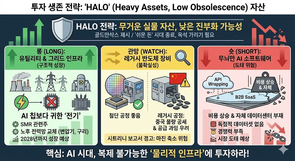 따라서 우리는 골드만삭스가 제시한 HALO 전략에 주목해야. 즉, AI가 대체할 수 없는 물리적 인프라 반드시 비중 가지고 있어야. 아무리 AI가 똑똑하더라도 실존하는 전략망이나 원자재, 첨단 반도체를 생산해 낼 순 없음. 이 외에도 AI가 대체하는데 한계가 있는 중공업, 방산, 필수재 관련한 업종 등에도 주목하고 발굴해야.
