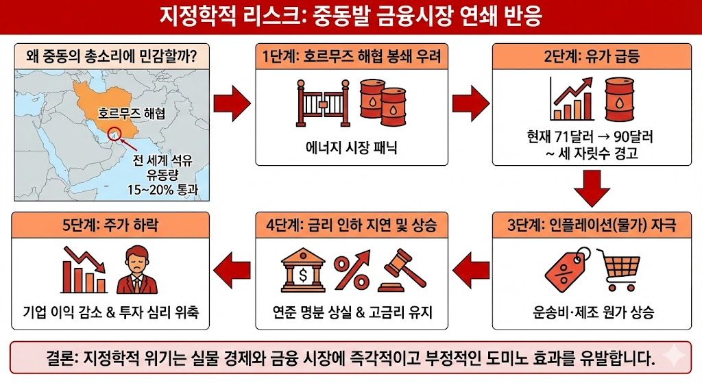 미국과 이스라엘, 이란 공습 -> 하메네이 사망 -> 호르무즈 해협 봉쇄 -> 유가, 물류, 운행비 급등 -> 인플레이션 자극 -> 금리 인하 지연 혹은 상승 -> 주가 하락