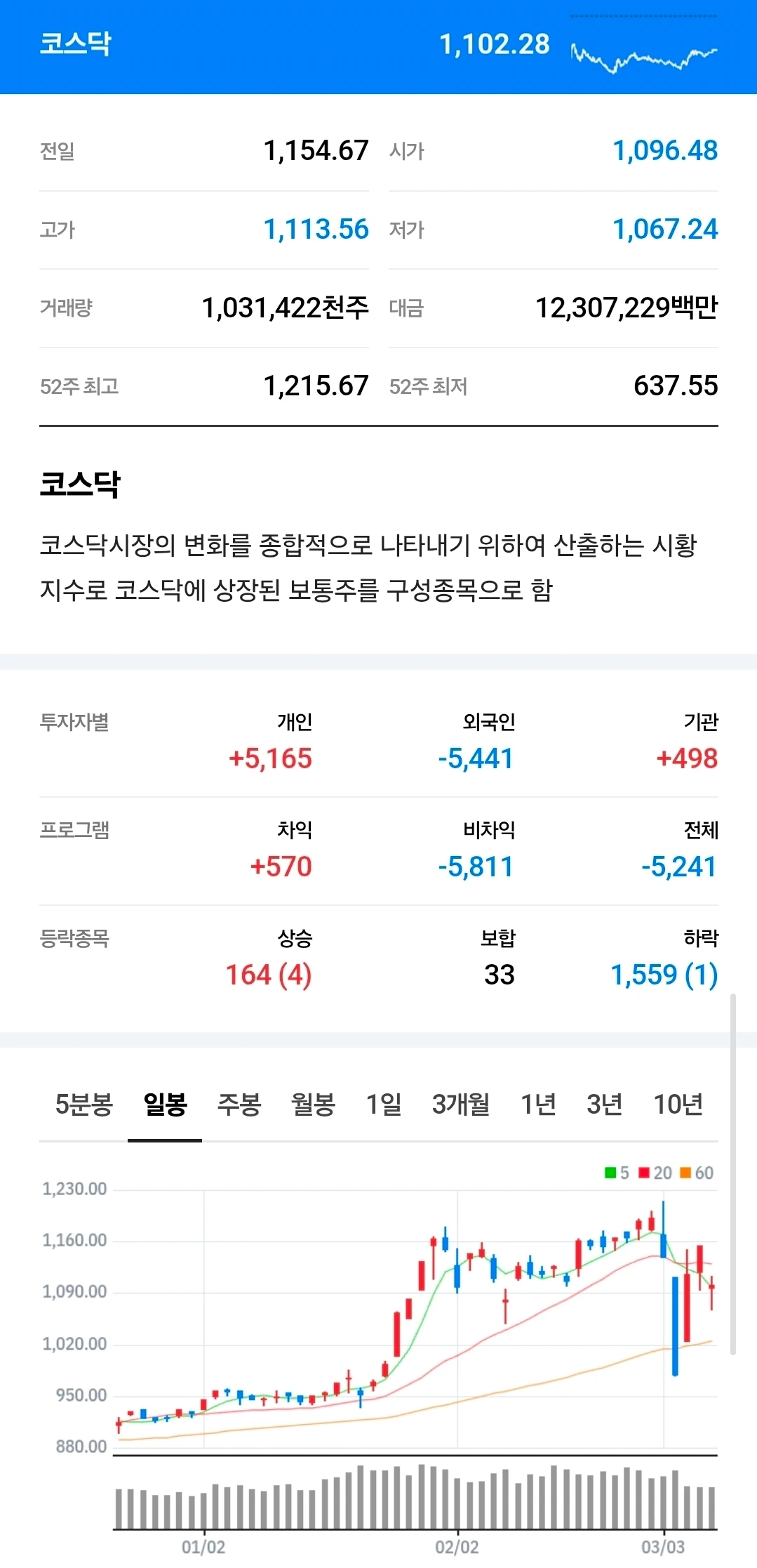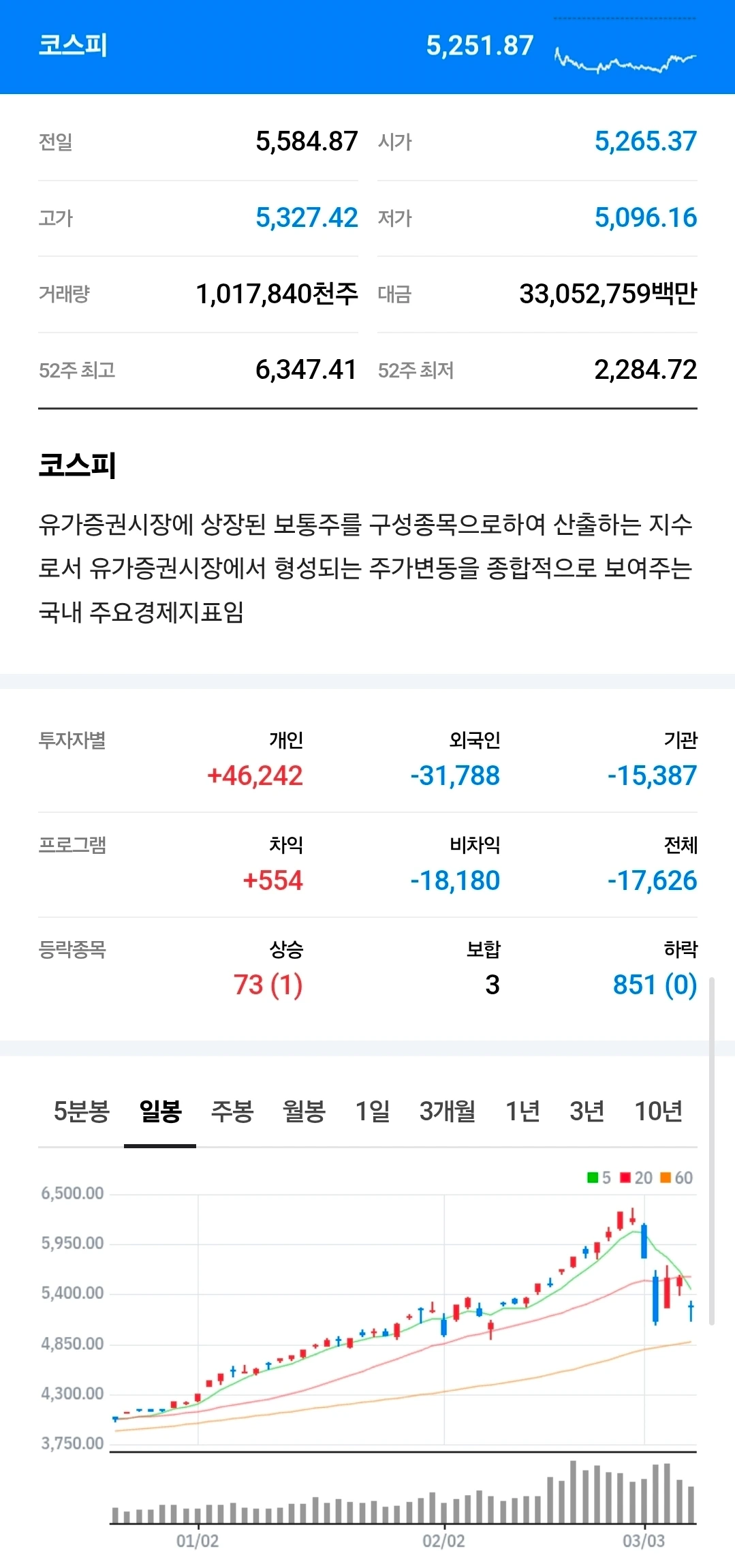 코스피는 5000p에서 6300p 중반까지 조정 없이 달려왔던 터라 셈법이 다소 복잡한 면이 있습니다. 미국은 별다른 변동성이라고 하기엔 애매한 수준의 등락만 반복하며 박스권에 갇혀 있지만 국내는 미국의 2~3%대 등락에도 크게 출렁이는 상황입니다. 즉, 전쟁 리스크와 역사적 고점에서 흔히 나타나는 조정이 동시에 와 있는 국내는 한동안 변동성이 강하게 반복될 것으로 보입니다. 다만 5000p가 이전 저점으로 작용하여 강한 지지대 역할을 수행하고 있으며 정부도 5000p 부근까지 내려오면 기관 자금을 투입해 방어하다가 어느 정도 오르면 빠져나가는 식으로 대응하는 것으로 보인다는 점에서 5000p 언저리가 적절한 타점으로 보입니다. 하지만 최악의 경우에 5000p가 깨지면 반대매매와 프로그램 자동 손절, 패닉셀 등이 연쇄 작용할 수 있으므로 반드시 분할 매수하고 현금 비중을 가지고 있어야 하는 시점입니다. 개인적으로 다음 주에 연준의 금리 결정이 있어서 이번 주를 지나면서 전쟁 이슈도 어느 정도 안정될 것으로 예측되니 폭풍이 지나간 후에 자리를 찾아가는 것도 바람직한 선택일 겁니다.