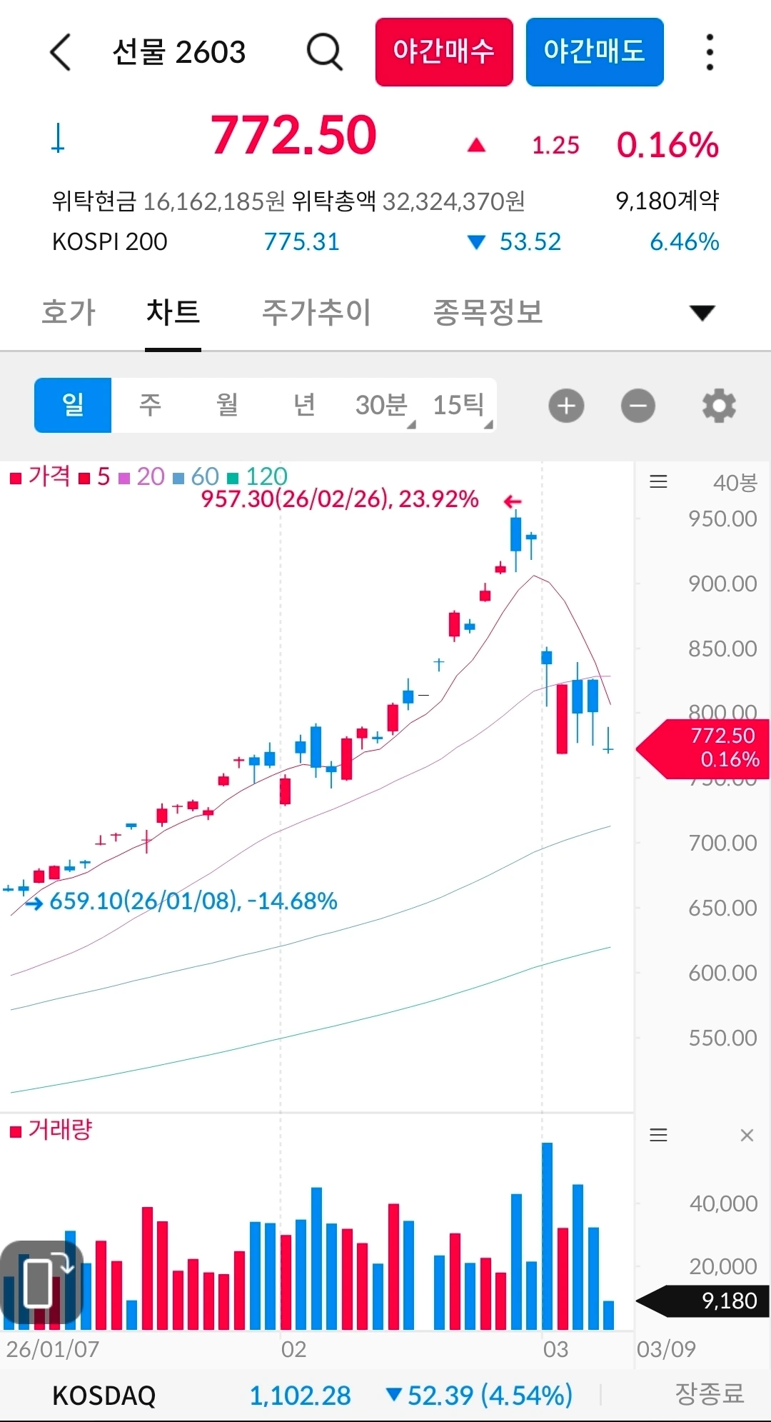 한편으로, 지난주부터 전쟁 이슈에 기인한 미국 증시와 코스피 야간 선물의 움직임이 국내 정규장과 정확히 커플링 되어 매번 힌트를 얻을 수 있었던 점을 주목해야 합니다. 예를 들어, 오늘의 하락은 금요일 미국 증시의 하락(특히 엔비디아, 샌디스크, 마이크론 등 국내 반도체 관련주가 제법 빠짐)과 코스피 야간 선물의 하락, 국제 유가 선물의 급등 등에 의해 상당 부분 예견된 바 있으며 지난 목요일 급등 때는 코스피 야간 선물이 8% 상한가를 기록했다는 점에서 개장 전부터 V자 반등을 기대할 수 있었습니다. 결과적으로 최근의 변동성은 국내 증시나 기업의 문제가 아닌 전쟁 이슈로 인한 등락이니 이번 한 주도 미국의 상황을 예의주시하며 대응하는 게 관건입니다.