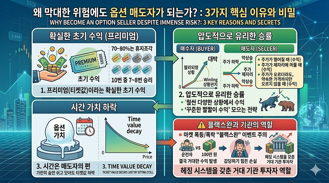 물론, 시장이 예상과 반대로 폭등하거나 폭락하는 '블랙스완' 발생하면 매도자는 감당하기 힘든 손실을 볼 수 있음. 그래서 주로 막대한 자본과 위험 분산(헤징) 시스템을 갖춘 거대 기관 투자자들이 매도자.