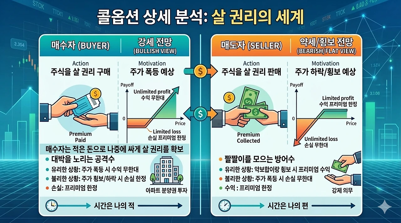 매도자 (Seller) : 횡보장 땐 프리미엄 수익을, 하락장에선 보험을 들어두자