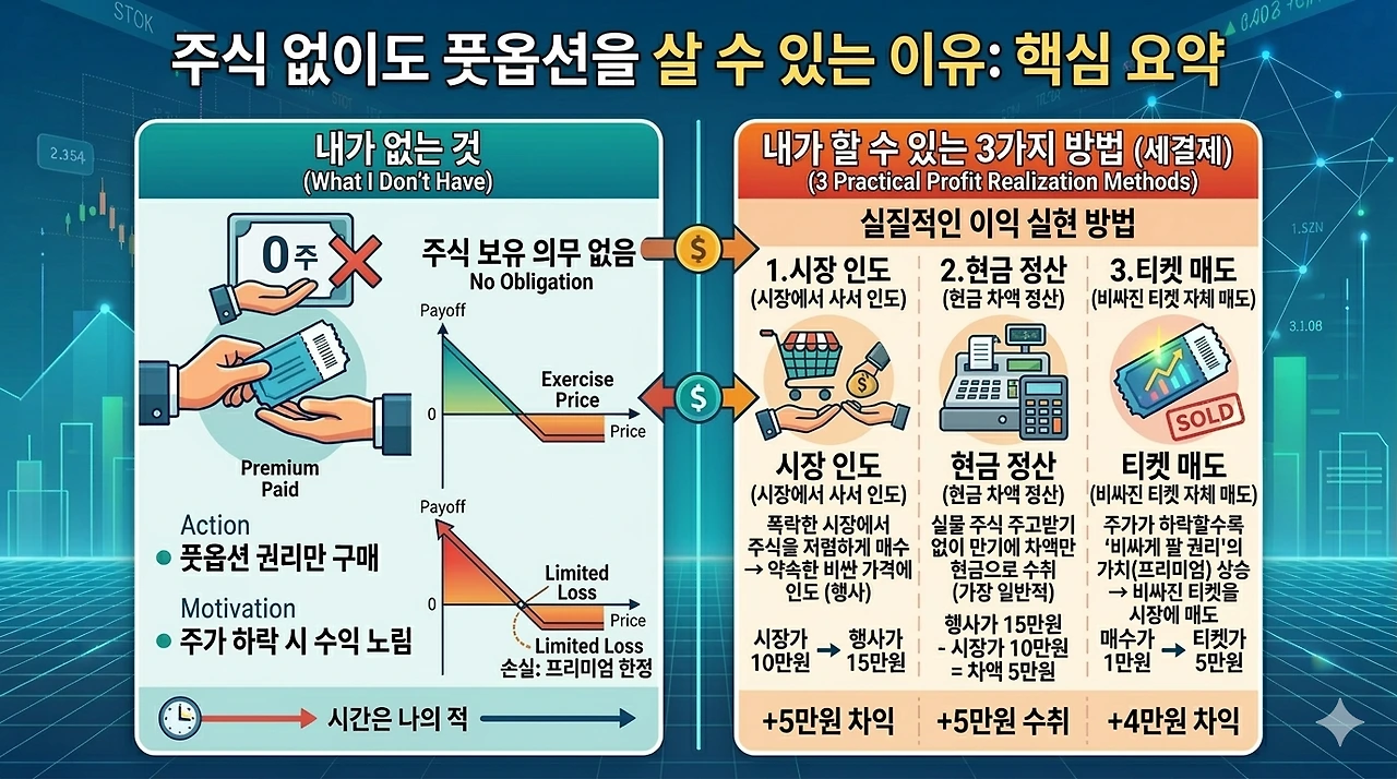 주식이 없어도 풋옵션을 살 수 있는 이유는, ① 시장에서 사서 넘기면 되고, ② 차액만 현금으로 정산받을 수도 있으며, ③ 비싸진 옵션 티켓 자체를 팔아버리면 되기 때문.