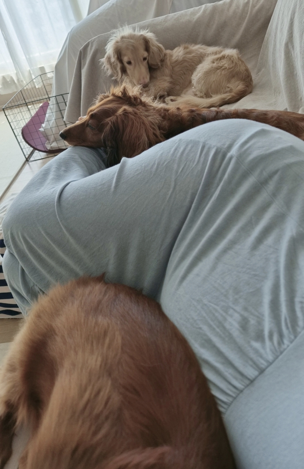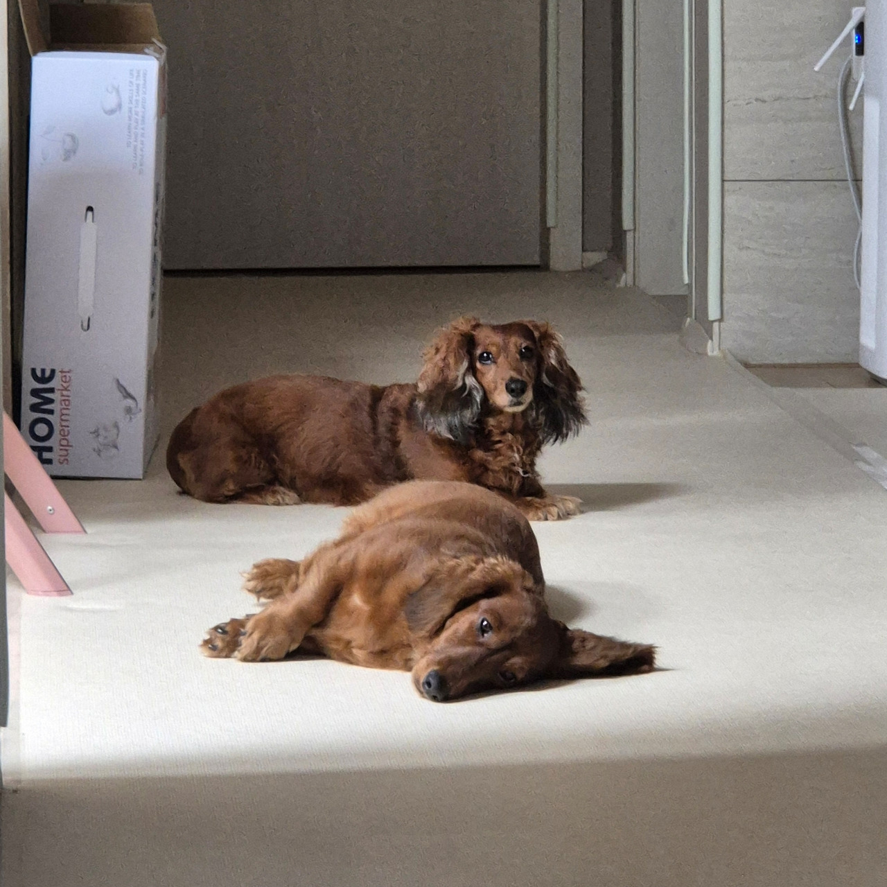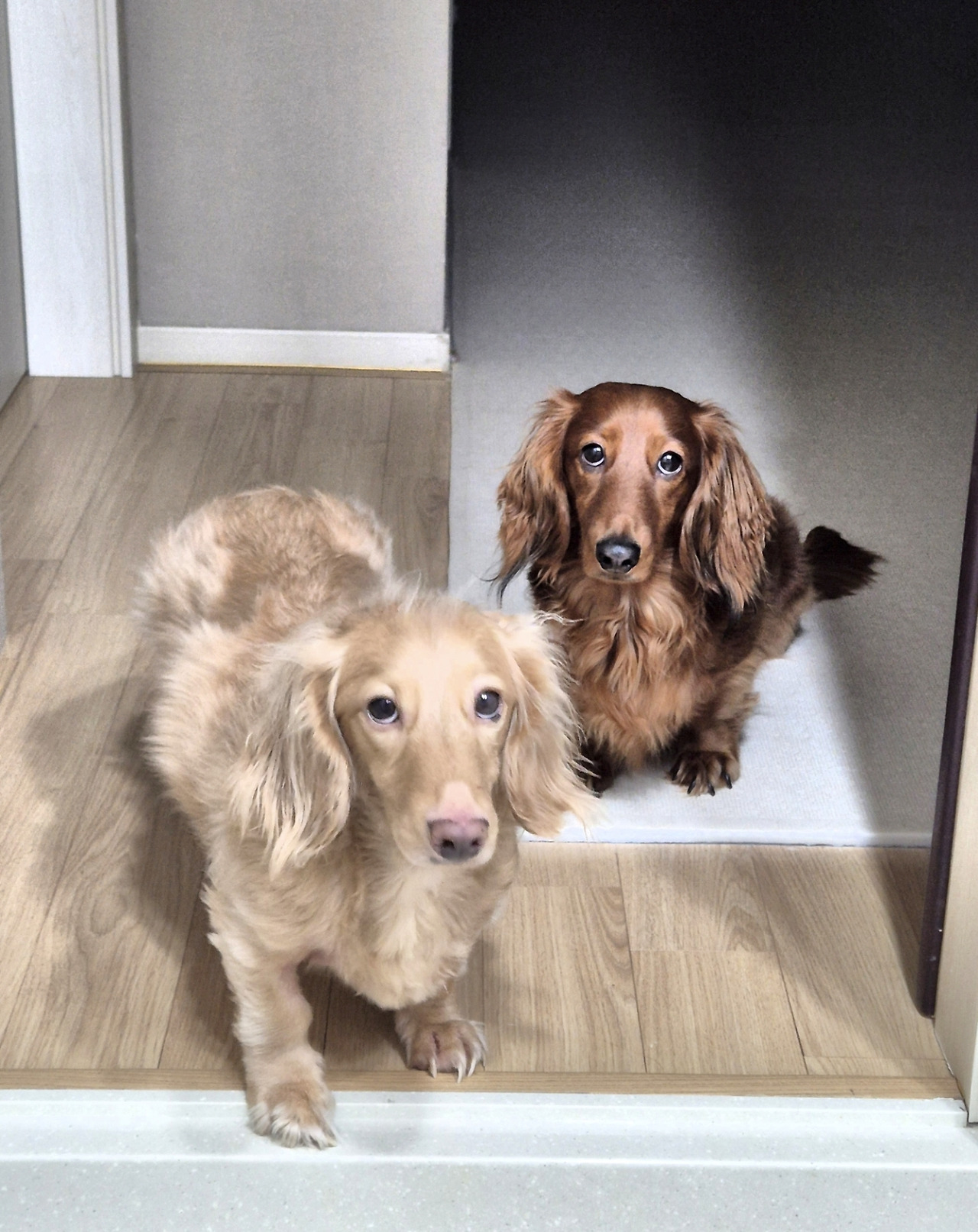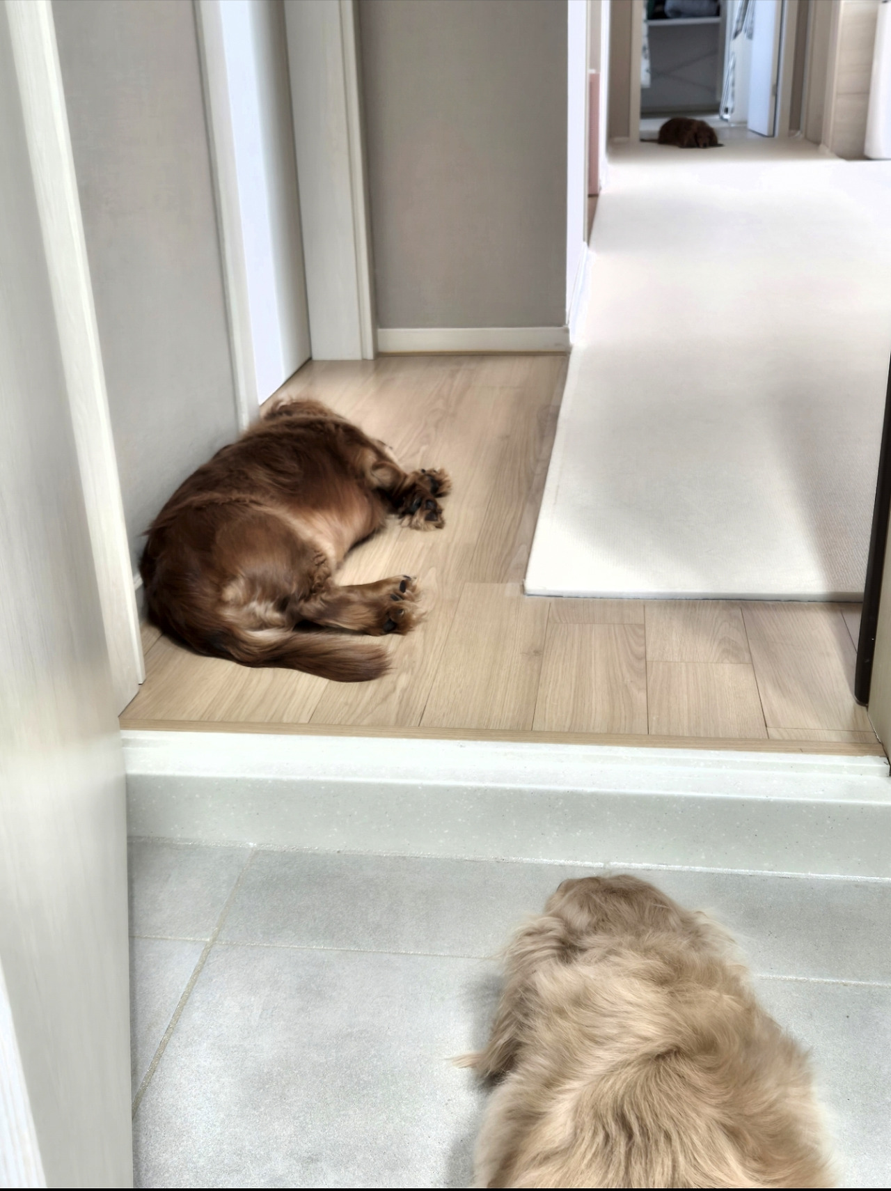 막달 즈음에는 모두 모여 이렇게 화장실 앞을 지켜주었다. 왼쪽 사진은 저 멀리 방문 앞에 나은이까지 3마리가 따라다니는 모습이다. 오른쪽 사진은 나은이가 디스크 수술로 입원해 있어서인지 2마리가 나를 더 걱정스러운 눈으로 바라보는 느낌이다.
