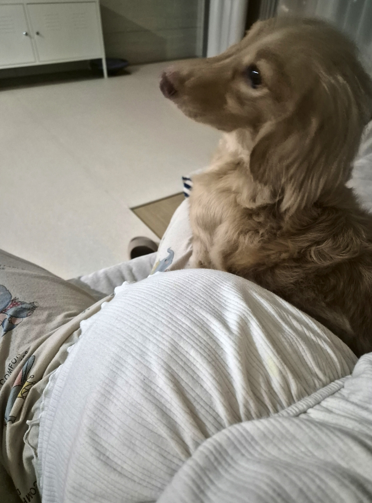 낮이든, 밤이든, 새벽이든 우리 집 강아지들은(특히 나르) 내가 화장실에 가면 문 앞에서 내가 나올 때까지 기다린다. 기다리다 지쳐 누워있지만 시선은 화장실 문을 향해있다. 막달에 가까울수록 화장실에 가는 횟수도 비례했는데 나르는 언제든 내 뒤를 종종걸음으로 따라와 주었다. 새벽에도 졸린 눈을 하고 있지만 화장실 안까지 따라 들어와 내 발 밑에서 나를 지켜주었다. 내가 가는 걸음마다 한 뼘거리에 나와 온기를 나누는 존재가 있다는 것이 얼마나 꽉 찬 감정인지. 주인에 대한 무한한 믿음과 복종의 의미일 수 있지만, 나는 이걸 사랑이라 생각한다.