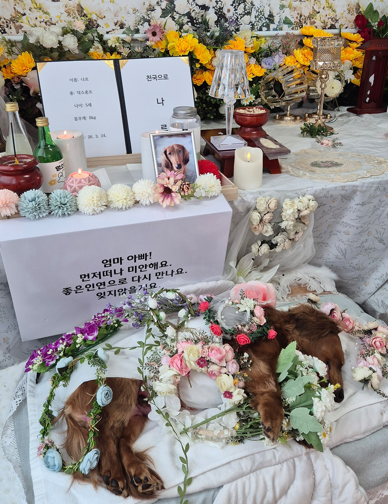 나르야, 무지개다리 잘 건너고 있니? 혼자 가는 길 무섭지는 않아? 갑자기 많이 아프고 힘들었지? 8일 사이에 4번의 큰 수술을 잘 견뎌주었는데 너의 작디작은 몸으로 버티기에 무리였나 봐. 가족 없는 병원이라 힘을 더 못 내었나. 엄마가 더 자주 가있을걸 그랬나. 엄마가 면회 갈 때마다 너무 울어서 나르가 가버렸나. 온유에 너희 셋 돌보는 엄마가 힘들까 봐 가버렸나. 엄마는 오만가지 후회와 아쉬움으로 긴 밤을 보내고 있어. 엄마가 내일 다시 올게 했잖아. 불편한 몸으로 나를 보려고 일어서려는 모습이 눈이 밟혀 한 번 더 보고 왔는데. 한 번 더 들어가서 안아줄걸 그랬다. 3월 23일 강아지의 날인데 엄마가 매년 꼭 기억해 달라고 이 날 소풍을 떠났니.