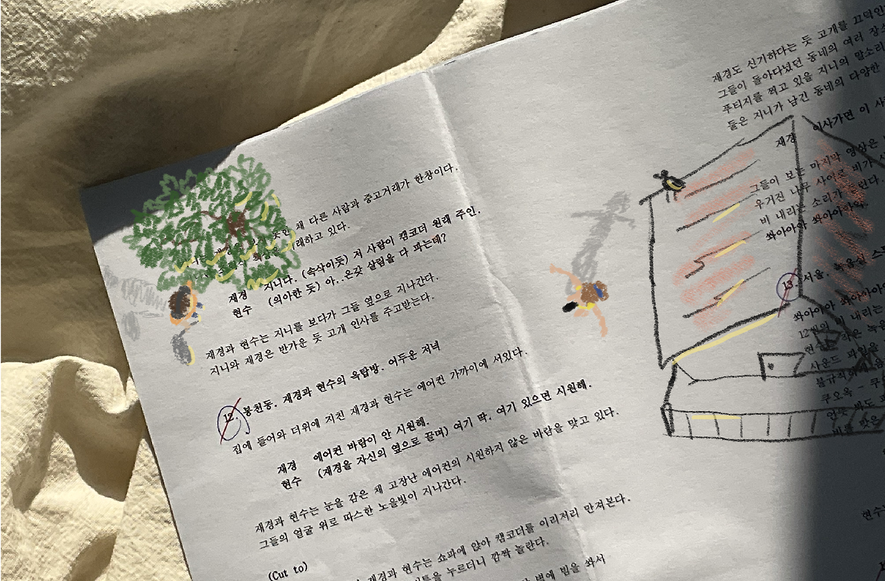 <햇볕을 볼 시간>은 배우와 함께 시작한 프로젝트여서 따로 캐스팅을 진행 할 필요는 없었다. 주인공 배우들과는 이전에도 함께 작업을 했었다. 그들이 누워있던 글을 일으키는 순간을 여러 번 목격했다. 이미 배우가 결정된 상태에서 시나리오를 쓰는 건 즐거운 경험이었다. 배우가 연기하는 것을 상상하고, 상상 속에 날아다니는 글을 옮겨적었다. 배우들에게 맞춰진 글을 썼다고 자부했지만, 첫 리딩은 늘 떨렸다. 1시간 정도 아이스 브레이킹으로 시간을 소모하고 나서야 리딩을 시작했다. 배우들은 박혀있던 활자들을 연처럼 하늘에 훨훨 날리며 시나리오를 읽어 내려갔다. 그리고 그들의 생각을 더 해 근사한 장면들을 만들어냈다. 처음부터 연출과 배우의 생각이 일치하진 않는다. 그러나 서로의 생각을 열고 나눌 수 있다는 점에서 리딩(리허설)은 늘 흥미롭고 재미있다.