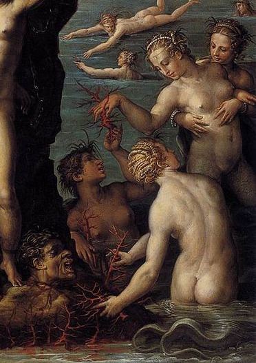 산호의 기원에 대한 이야기는 고대 로마의 시인 오비디우스가 쓴 설화집 [변신 이야기] 에서도 찾아볼 수 있는데, 거기서 그는 메두사의 상처에서 솟구친 피를 해초가 빨아들여 붉고 단단해져 산호로 변했다고 썼어요. 바사리 또한 저서 [회상] 에서 자신의 그림을 설명하며 산호가 생겨나는 순간에 대해 자세히 묘사했습니다. 그는 자신의 작품을 통해 그림 뒤 서랍에는 산호가 보관되어 있다고 말하고 있었던 거죠.
