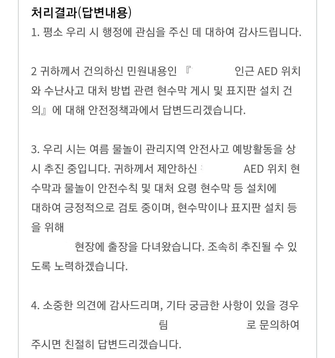 그래서 그날 나는 집에 돌아온 후 민원을 하나 넣었다. 해당 계곡에 AED 위치를 알 수 있는 표지판을 설치하고, 현수막을 게시해 달라는 내용이었다. 일주일 만에 받은 답변은 이랬다: 해당 제안에 대해 "긍정적으로 검토 중이며", 그 사이에 "현장에 출장을 다녀왔"다고.