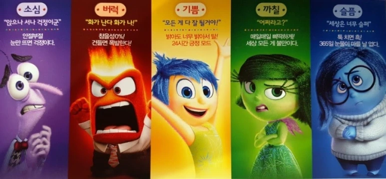 영화 ‘인사이드 아웃’로 예를 들어 보겠습니다. 심리학자들의 자문을 받아서 제작한 디즈니의 애니메이션 영화로 심리 영화의 수작으로 평가받습니다. 영화에서 심리의 기초가 되는 5가지 요소 – 기쁨이, 슬픔이, 버럭이, 소심이, 까칠이가 등장합니다.