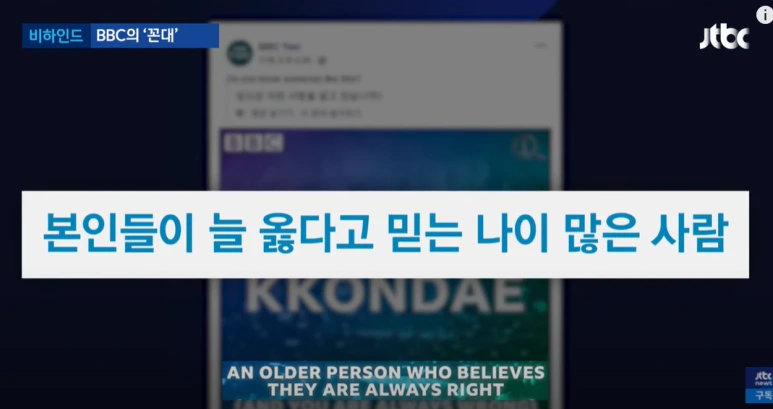 꼰대의 정의가 비교적 정확하다고 생각한다. BBC는 세대 간의 갈등으로 대두된 현상이라고 덧붙였다. 시대가 바뀌는데도 아직 변화하지 못한 기성세대를 꼬집는 밀레니엄 세대의 항변이라고 할 수 있다. JTBC에서 이에 대해 보도한 적이 있다.
