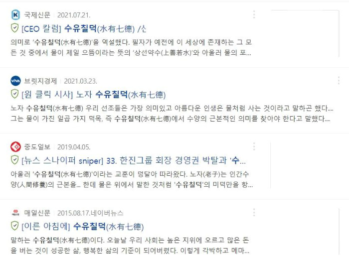 하지만 자주 인용되고 있는 '수유칠덕'의 덕목은 출처를 찾기가 어려웠습니다. 노자는 그런 덕목의 '수유칠덕'을 말하지 않았습니다. 그냥 '물이 가진 7가지 덕'을 노자와 연결했다고 생각합니다. 왜 이런 현상이 오랫동안 나타나고 있는 것일까요? 의문을 품지 않을 수가 없었습니다. 이 글을 쓰게된 이유입니다. 혹시 오류가 있다면 코멘트해주길 바랍니다.
