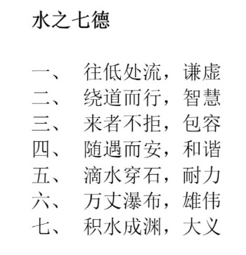 중국의 바이두를 통해서 검색해보니 물에서 지혜를 찾는 글이 많았고 수유칠덕(水有七德), 수유칠선(水有七善), 수지칠덕(水之七德)이란 글을 많이 발견할 수 있었다. 그런데 수유칠덕의 내용이 대부분 도덕경 8장의 일곱 가지 장점에 관한 것들이었다. 또 중국 여러 문헌을 종합해서 물의 일곱 가지 덕(수유칠덕)을 작성한 글도 있었다. 한국에서 자주 인용되고 있는 수유칠덕과 비슷한 내용을 찾았는데 그것은 그냥 '물의 일곱가지 덕(수지칠덕)'이었지 노자에 대한 언급이 없었다. 수유칠덕의 출처가 이 글인지 확인하긴 어렵다. 하지만 비슷한 내용이 수록돼 있어서 첨부한다.