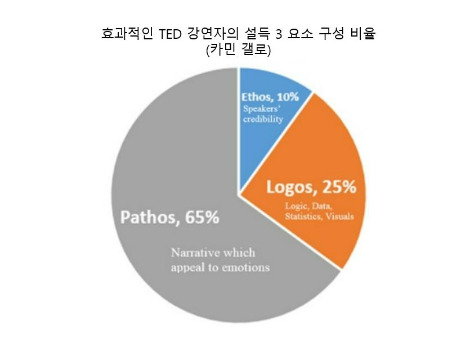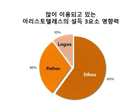 아리스토텔레스에 따르면 설득의 3요소는 에토스 Ethos, 파토스 Pathos, 로고스 Logos다. 그리고 그 각각은 설득을 할 때 차례대로 60%, 30%, 10%을 미친다고 설명한다.