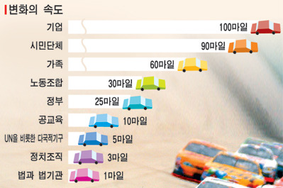 앨빈 토플러의 책 <부의 미래, 2006>을 보면 조직에 따른 변화 속도에 대한 언급이 있다. 기업은 시속 100마일로, 가장 빠르게 변화하고, 기업을 감시하는 시민단체는 90마일이다. 그다음 세 번째가 가족으로 60마일 속도로 변화한다. 토플러는 가족의 변화 속도가 빠른 것에 놀랍다고 말했다. 페이스북 트렌드 보고서를 보면, 가족의 변화 속도가 기업 못지않게 빨라진 느낌이다.