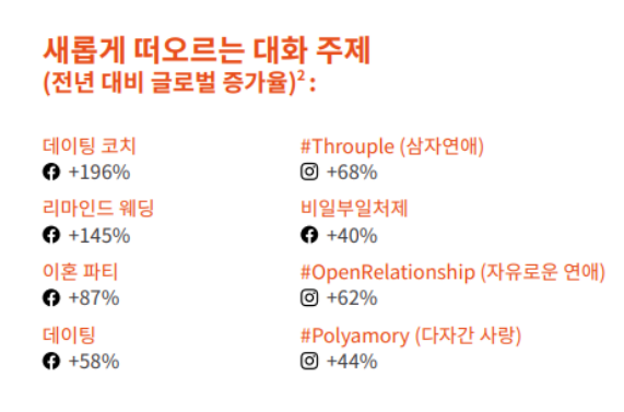 이와 더불어 눈여겨볼 사항은 사랑과 유대감에 대한 기대가 더욱 커져서 데이트 코치에 대한 대화가 늘어나고 있다는 것이다. 사람들이 연애 목표(RelationshipGoals)를 이루는 데 있어서 더 계획적인 접근을 취하고 있다.