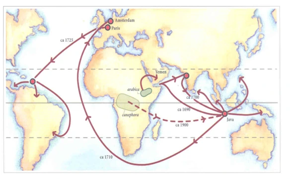 <커피 전파 경로 / 자료 : historiageografiadelacroix.wordpress.com>