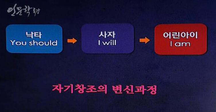 EBS 인문학 특강 '니체의 사상'에서 자료를 발췌했다. 나의 삶은 지금 어느 단계일까? 평생 낙타의 삶을 살고 있지는 않을까? 이제 어린아이의 삶을 살 좋은 기회이긴 하다. 어느 정도 짐을 벗어버리고 누구를 지배하지도 않으니까 'I am'의 삶을 살기에 가장 좋은 조건을 갖추고 있으니 말이다.