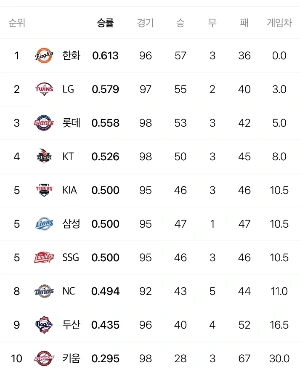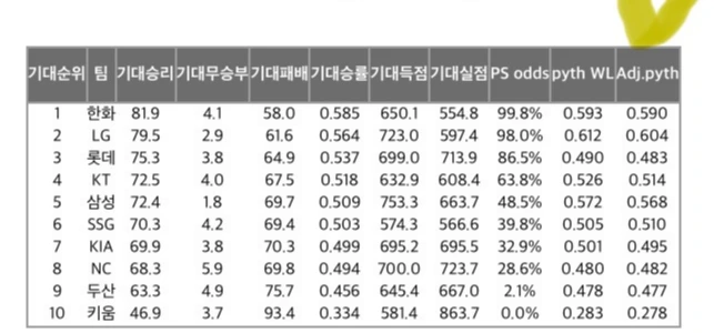 오히려 0.568의 예상 승률을 기록한 삼성이 순위표 세 번째에 이름을 올리는 것이 타당해 보일 수도 있어요.