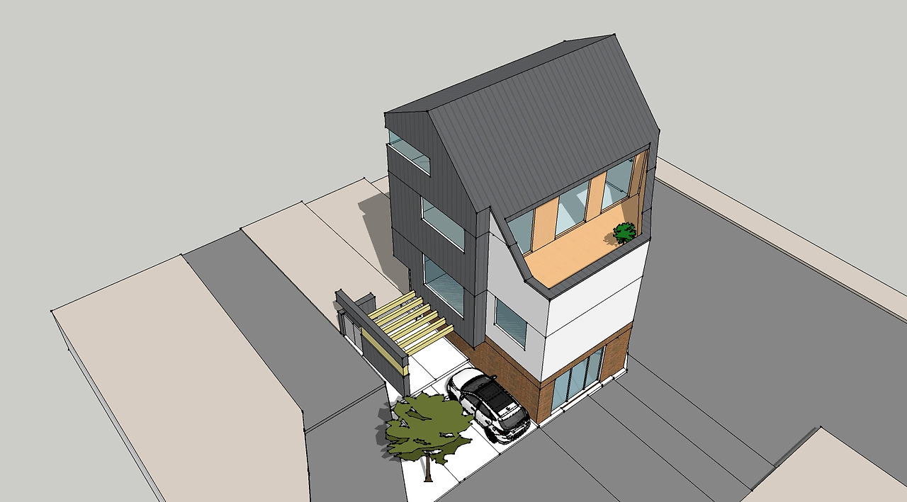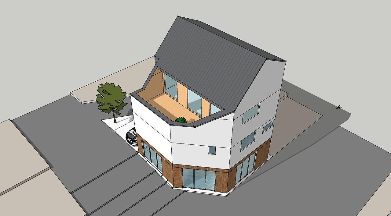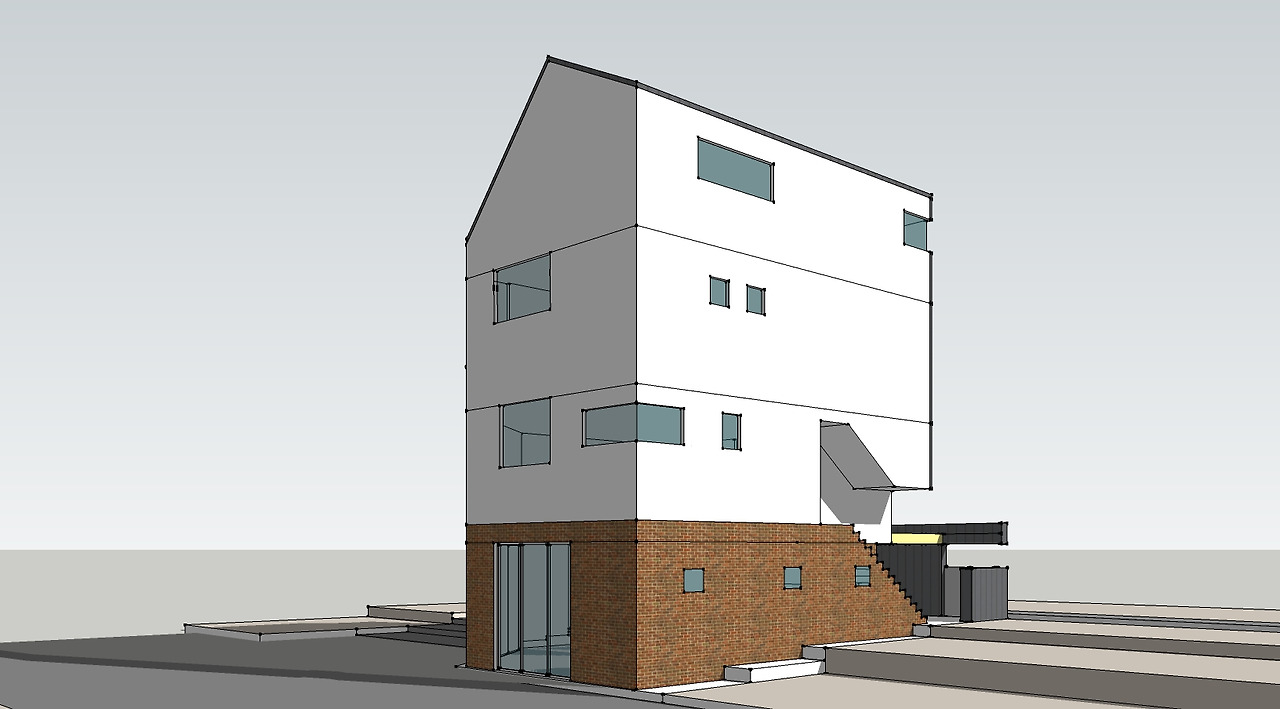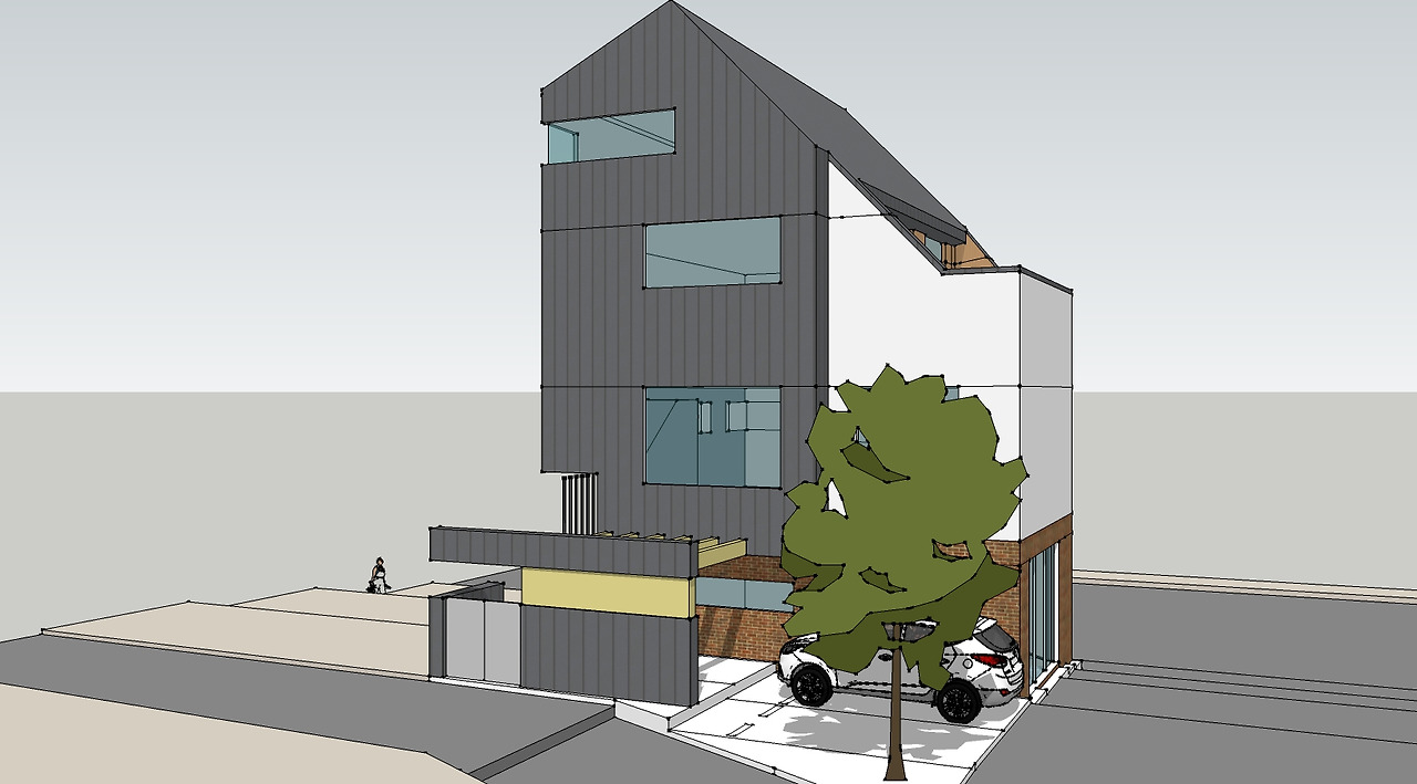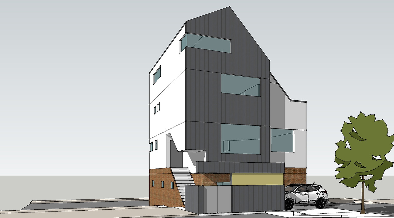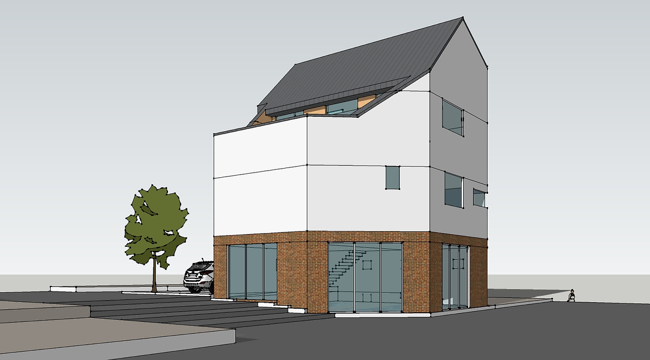 지상 3층에 옥상 정원을 동쪽 방향으로 계획하였고 옥상정원 쪽으로 경사지붕을 두어 운치 있는 분위기를 만들어 주고자 했습니다. 주택은 징크판넬과 백색 스터코 마감으로 하고 상가는 붉은 벽돌로 마감을 하여 주택과 상가가 서로 구분되면서 동시에 잘 어우러지게 디자인하였습니다.