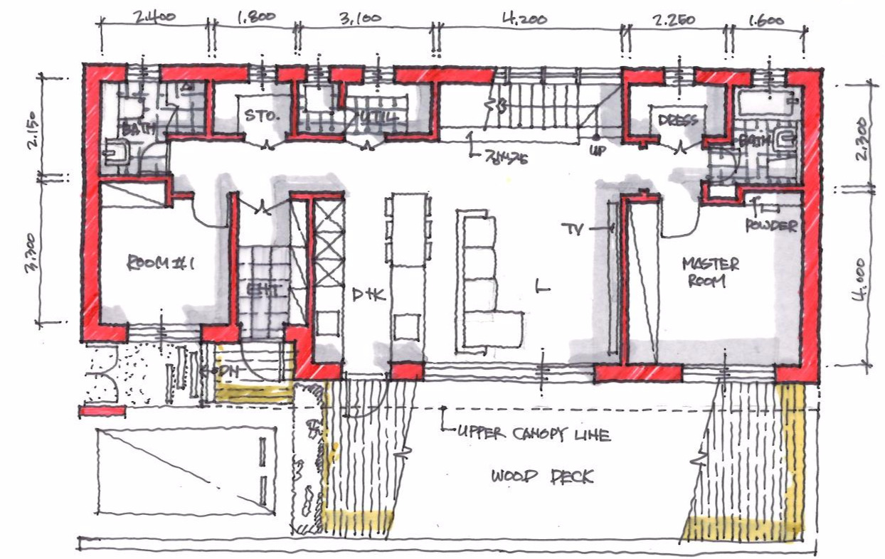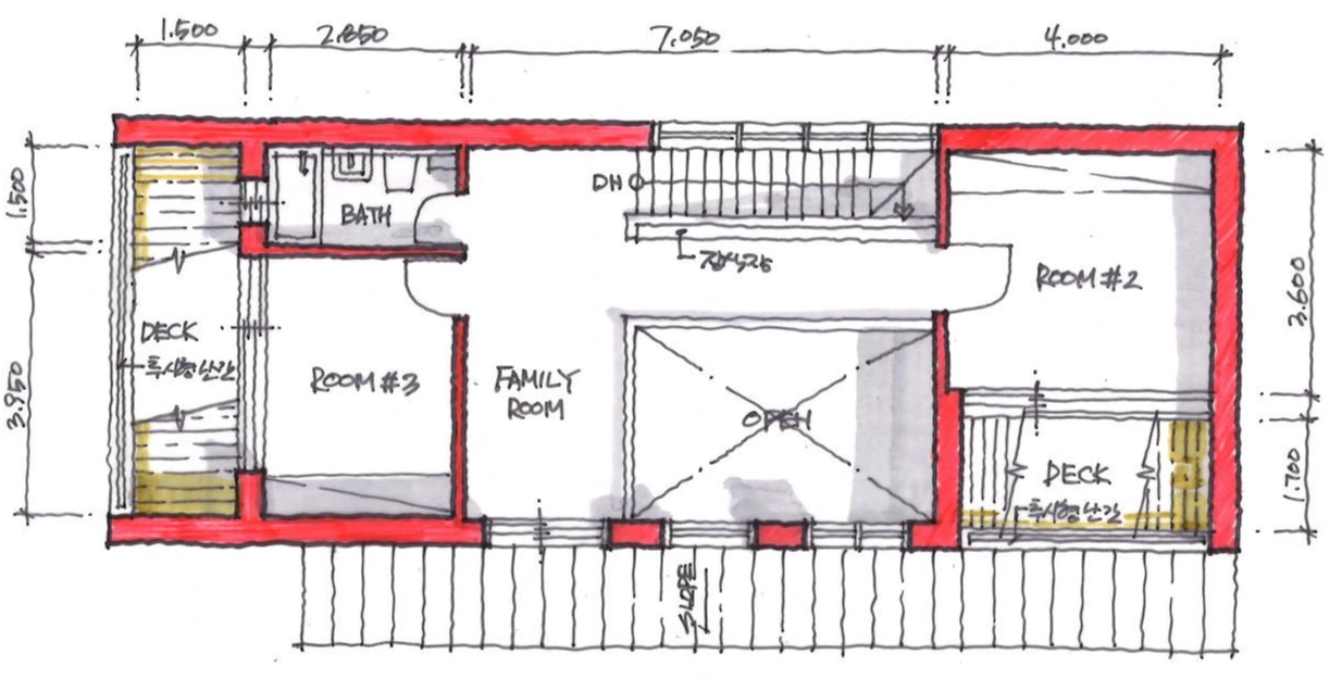 대지의 동, 서, 북쪽으로는 주변 주택과 사생활 침해가 우려되었고 도로 쪽으로의 소음을 고려하여 주택의 외부 벽은 창을 계획하지 않거나 두더라도 최소한 크기로 했습니다.