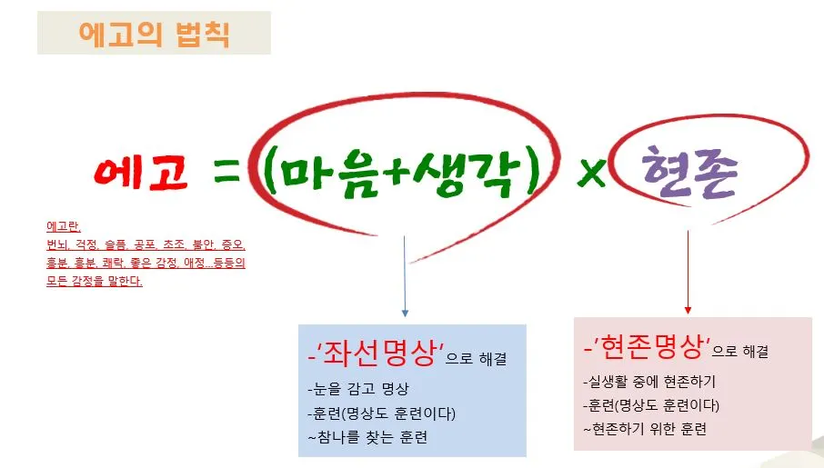 명상은 우리 안에 가득 찬 에고를 없애는 것이다. 에고는 3가지의 요인으로 발생한다. 마음, 생각, 그리고 시간이다. 무시간성(t=0)에 존재했을 때 이를 ‘현존’이라 한다.
