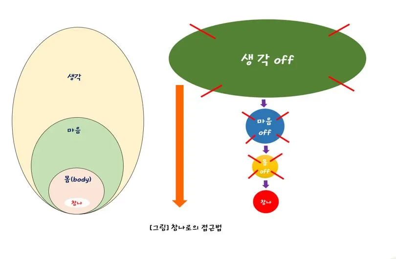 ‘참나명상’은 나를 둘러쌓고 있는 것 중에 최외곽에 위치한 생각을 먼저 없애고, 그다음 마음을 없애고, 몸을 없앨 때 비로소 참나가 드러나는 명상법이다.