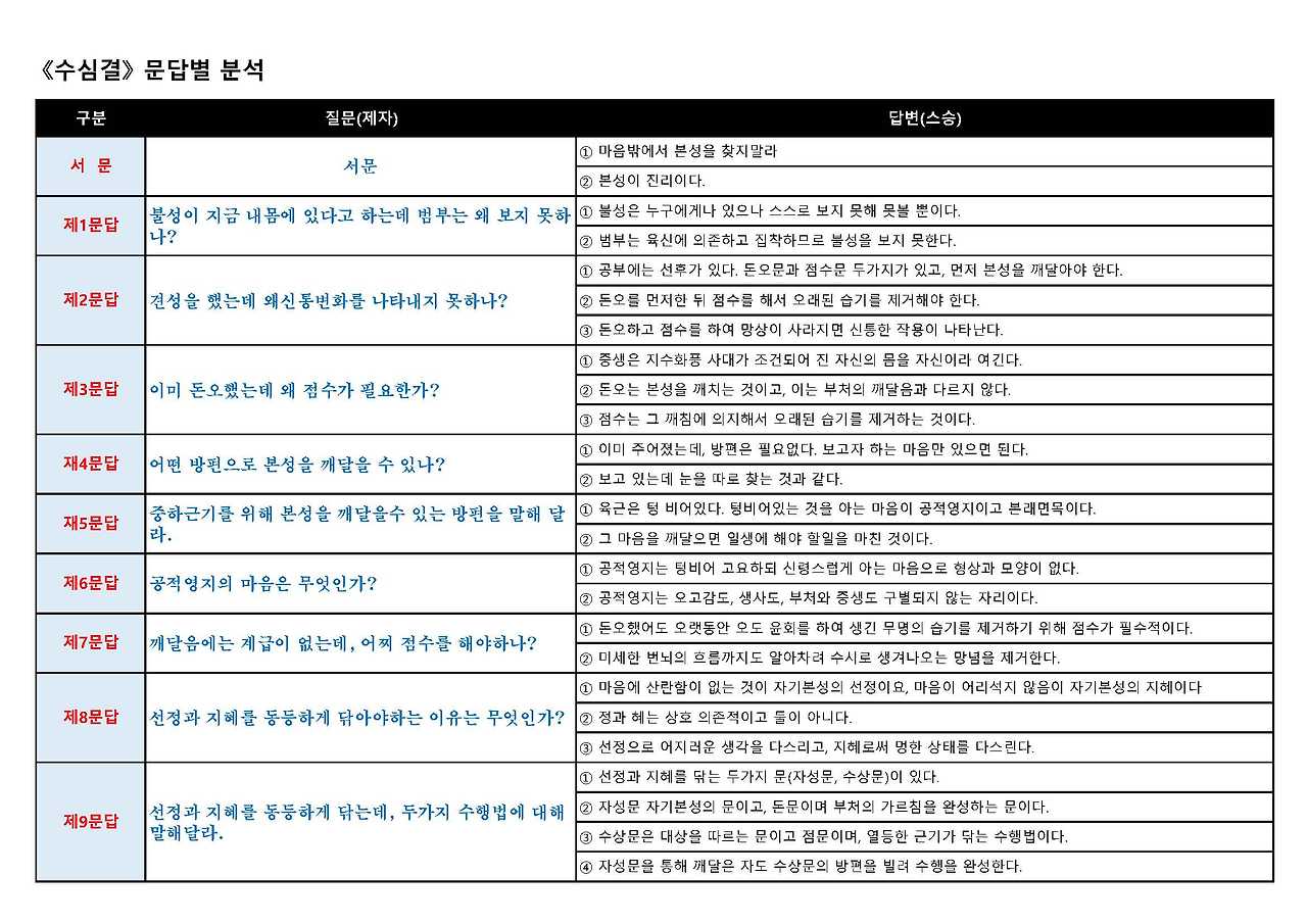 위 표는 <수심결>의 9문 9답을 표로서 정리해 보았다.