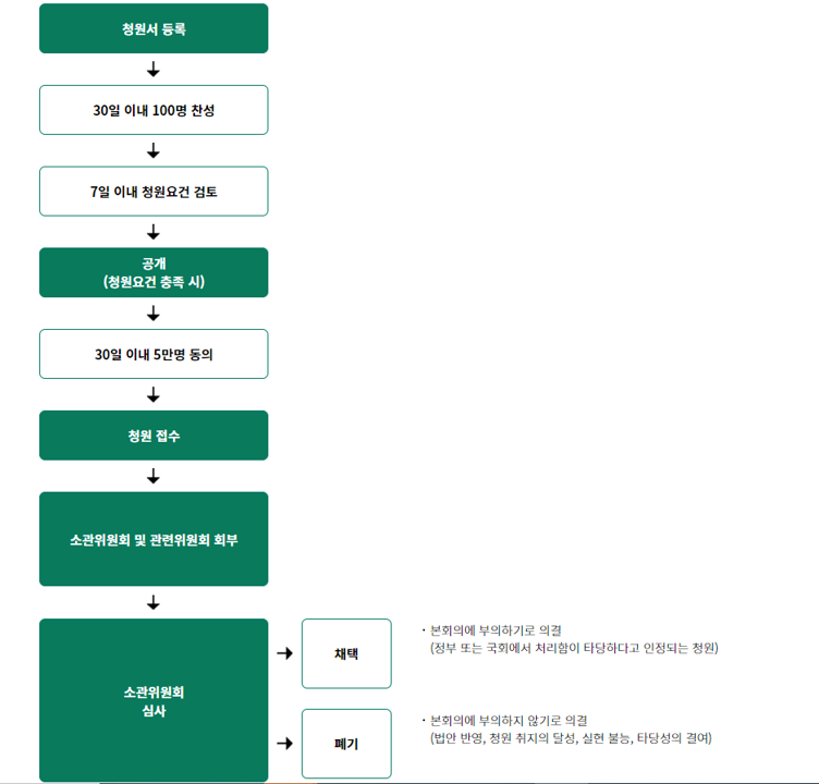 써놨던 내용 복붙해서 올리는 거라 딱히 어려운 건 없었고 대신 30일 내에 100명이 찬성해야 7일이내 요건을 검토해서 공개가 되고, 그 뒤 다시 30일 이내에 5만 명이 동의해야 위원회에 접수가 되는 시스템입니다.