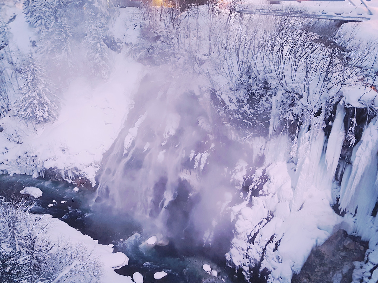 원래 비에이 투어를 신청하면서 제일 기대했던 건 청의 호수(아오이 이케)였는데 푸른 물빛을 전혀 볼 수 없을 만큼 눈이 쌓인 상태여서 들르지 않고 지나쳤다. (결국 이것 때문에 이 해 여름, 다시 비에이를 찾게 된다. 여름 홋카이도는 다른 글에서 다시 다룰 계획이다.) 대신 흰수염폭포는 수산화 알루미늄이 포함된 따뜻한 온천수가 에메랄드 빛을 내면서 눈 쌓인 절벽 사이사이로 흘러내려 판타지 영화에서나 볼 법한 풍경을 만들어내고 있었다. 청의 호수를 보지 못하고 지나친 아쉬움을 달래주느라 더 열일하고 있는 것 같았던 흰수염폭포는 근처 다리 위에서 감상할 수 있다. 여행 책이나 블로그, 인스타그램에서 본 사진들이 거의 사진발이겠거니 생각했다가, 같이 보러간 사람들 전부 탄성을 지르며 한참을 넋 놓고 쳐다보다 왔다. 다리 이쪽저쪽을 뛰어다니며 사진을 잘 찍어볼 각도를 연구했지만, 이곳은 어떻게 찍어도 사진이 실제 풍경을 다 담아내지 못할 것 같다. 여름 비에이 여행을 다녀오고보니, 여긴 확실히 겨울 풍경이 더 멋지다.