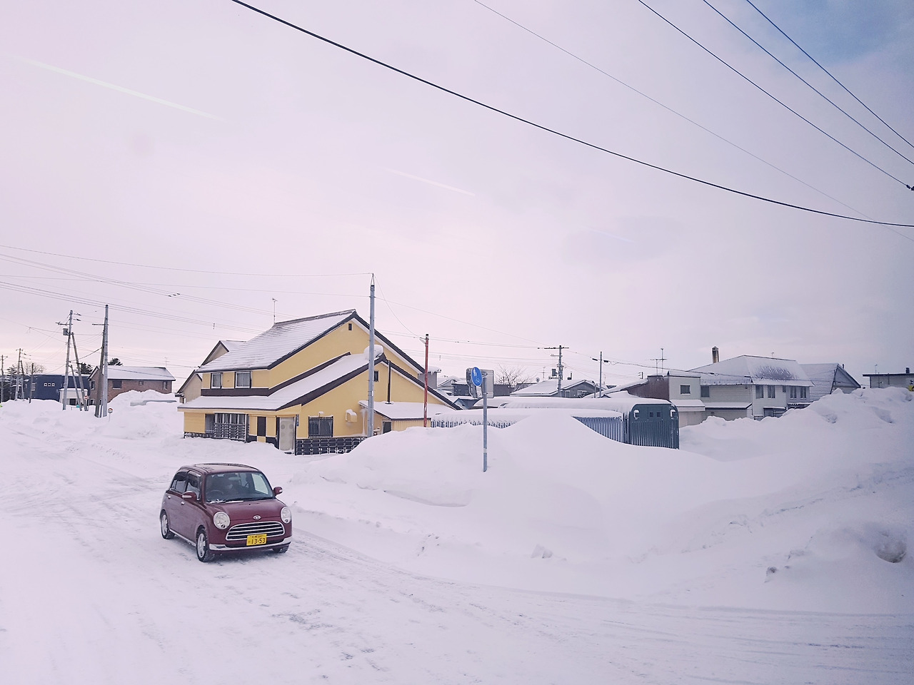 고속도로 진입이 어려워지는 바람에, 결국 비에이역까지 국도를 타야했는데, 가이드가 말하길 홋카이도가 원래 눈이 많이 오기로 유명하지만 이날같이 많이 오는 날은 또 손에 꼽는다고 할 정도로 눈이 몰아쳤다. 빠른 제설 작업이 불가능할 만큼의 눈이었는데, 이렇게 계속 눈이 몰아치면 과연 투어를 계속하는 게 가능할까 걱정스러운 마음에 기사아저씨가 운전하는 모습을 좌석 너머로 빼꼼히 쳐다봤다. 가이드가 그걸 본 건지 베테랑 기사 아저씨를 소개했다. 홋카이도에서만 운전 경력이 20년 가까이 되는 분이라는데, 운전 경력 20년보다 더 중요한 건 '홋카이도에서만'이었다. 운전 면허증 취득이 쉽지 않은 일본 내에서도, 홋카이도의 운전 경력은 다들 알아주는 스펙이 된다. 그러니까 홋카이도는 눈길 운전을 위한 거친 트레이닝을 하기에 최적의 장소인 셈이다. 긴 설명 끝에 조금은 안심을 하고 창밖을 내다보니, 고속도로를 탔으면 절대 볼 수 없었을 마을의 풍경들이 지나치게 가깝게 보였다.