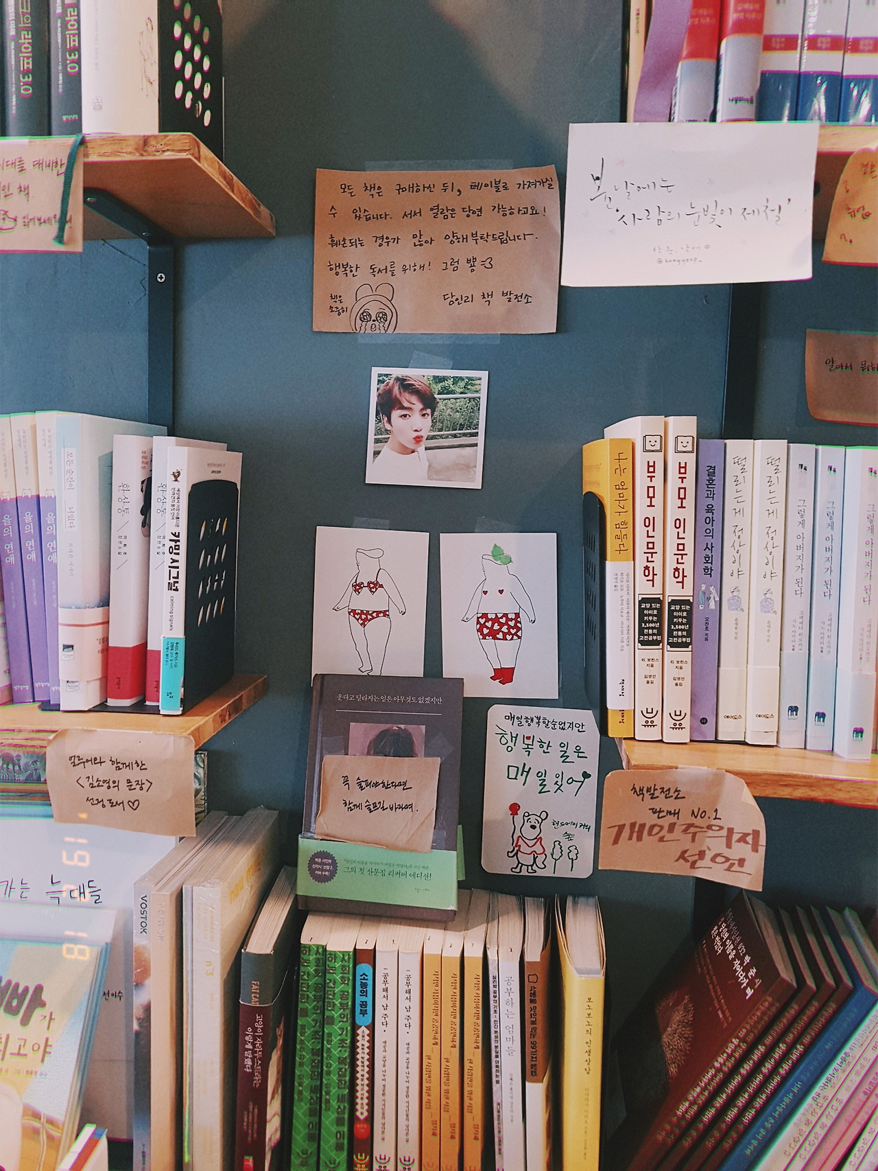 + 공간에 대한 여담을 덧붙이자면 당인리책발전소는 방문할 때마다 운이 좋았던 건지 김소영, 오상진 부부를 항상 마주쳤다. 위례점이 더 크게 오픈했다고 들었는데 아직 가보지 못했지만 나는 아늑한 이 공간이 마음에 든다. 책방에서는 그저 책방 주인장으로서 충실하겠다는 포즈로 이리저리 책을 나르고 묵묵히 노트북 작업을 하는 그들을 볼 때면, 굳이 사인을 받거나 사진을 찍어달라는 불편한 요청은 하고 싶지 않아진다. 대형서점과 달리 작은 서점의 성공 요인은 서가에 주인장의 취향이 개성 있게 반영되어 있는지, 그 취향과 코드가 맞는 방문객들의 마음에 닿을 만한 분위기의 공간인지 두 가지에 있다. 대형 서점에서도 구입할 수 있는 동일한 책이라 하더라도 주인장의 선택을 신뢰하고 찾는 방문객에게는 대형 서점에 쌓여 있는 그 책과 동일한 책일리 없다. 완전히 독립출판물만 다루는 서점보다는 어떤 책이든 경계 없이 주인장이 직접 재구성해서 메모를 겻들인 서가가 있는 이런 곳이 좋다. 물론 여기는 취향과 생각이 통하는, 책으로 맺어진 셀럽 커플의 사랑과 정성이 담긴 특별한 공간이기도 해서 찾는 이들의 발걸음이 끊이지 않는다는 것도 성공 요인으로 인정해야겠지만 말이다.