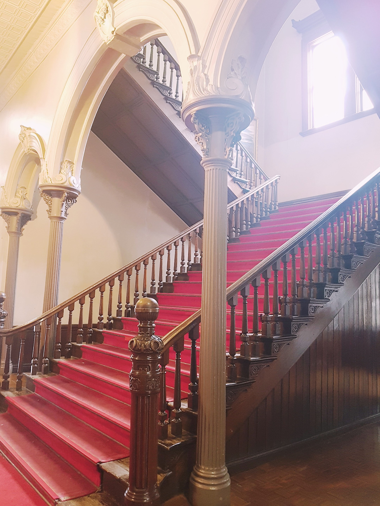 건물 입구의 아치형 기둥과 붉은 카펫(왼쪽), 건물 내부에서 바깥을 내다 본 삿포로 시내의 아침(오른쪽)