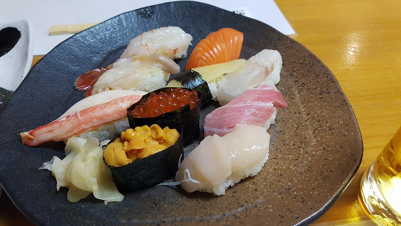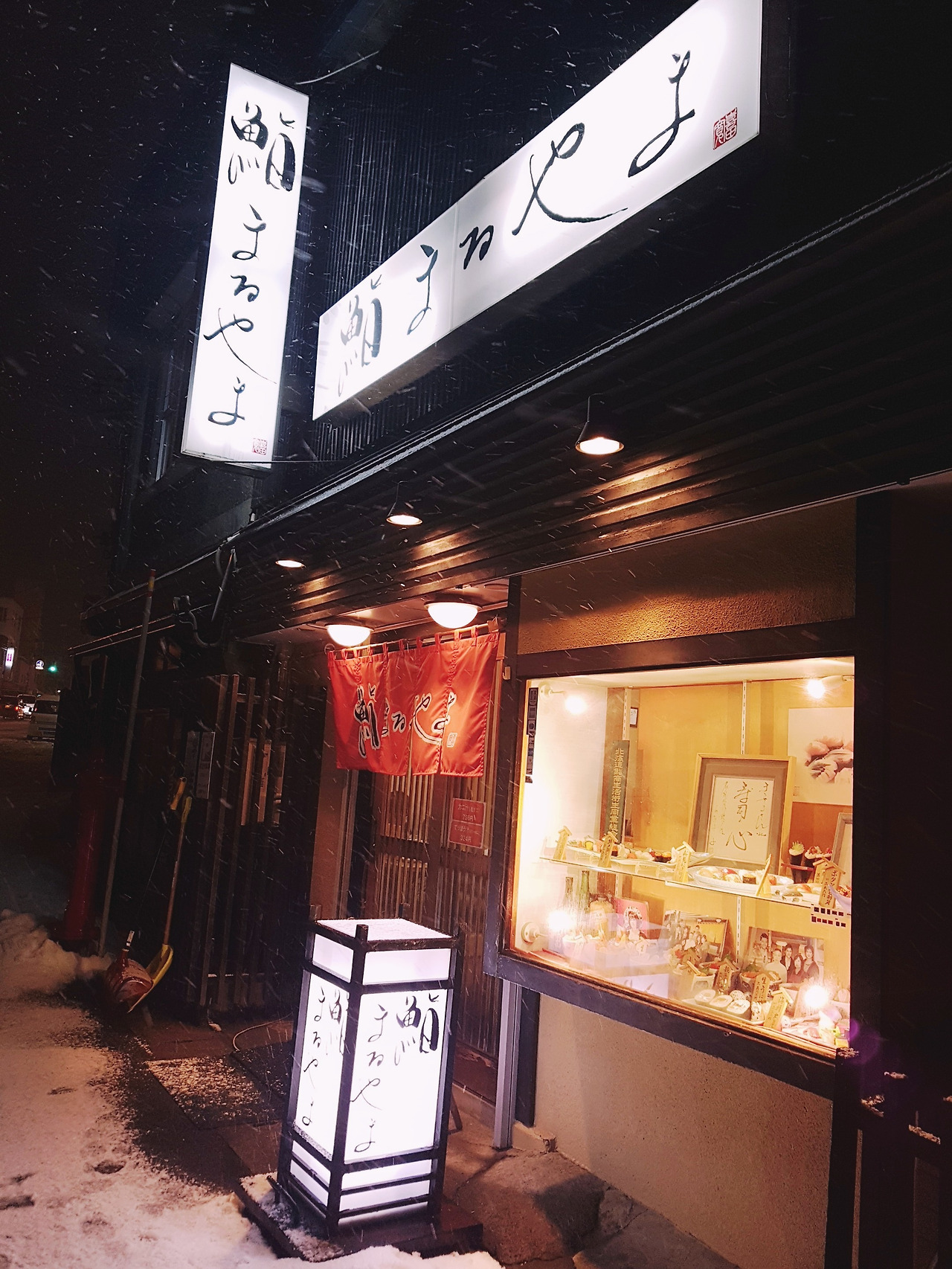 운하에서 겨우 사진 몇 장을 건지고나니 거짓말처럼 다시 눈발이 거세지기 시작했다. 진눈깨비에서 제대로 눈으로 바뀐 듯했다. 바람까지 불어서 거의 눈보라 수준이었는데, 해지고 눈발 날리던 오후 4시 30분 오타루의 스시거리는 거의 모든 스시집이 다 브레이크타임이었다. 대략 한 시간 정도는 기다려야 어디든 들어갈 수가 있는 것 같았는데, 싸구려 우산으로 거센 눈발을 막아내는 건 역시 무리였다. 우리가 원래 가려던 마사즈시(미스터 초밥왕의 배경이 되었다는 스시집인데, 초밥왕 씨는 초밥을 너무 비싸게 판다.) 앞에서 메뉴판을 보면서 이대로 눈사람이 되어 기다려볼까 그냥 삿포로로 출발할까 고민하는데, 급 우울감과 피로감이 몰려왔다. 문 연 스시집을 찾아보겠다고 골목 사이사이로 돌아다니는 바람에 오타루 역까지는 다시 꽤 걸어가야하는 상황이었는데, 춥고, 배고프고, 지친 몸을 이끌고 걸어가자니 눈발은 날리고 날은 더 어두워져버렸다. 갑자기 멈춰 버린 열차 때문에 막막한 눈밭에서 버스를 세 대나 보내야했던 어제의 기억이 떠올라 서글퍼지니, 오타루 스시고 뭐고, 일단 따뜻한 곳에서 몸을 녹이고 싶은 마음이 간절했다. 거리의 그 많은 사람들이 날씨 때문에 다들 일정을 바꾼 건지, 갑자기 인적이 드물어지니 문득 겁도 났다. 그렇게 눈 속에 파묻히듯 우울감에서 헤어나오지 못하고 무거운 다리를 억지로 옮기고 있는데, 갑자기 갑자기 반짝, 노란 불빛이 켜지면서 셰프로 보이는 아저씨 한 분이 브레이크타임 표지판을 거두셨다. 그러고는 우리 쪽을 한 번 슬쩍 쳐다보셨다. 무뚝뚝한 인상의 아저씨였지만, 아까부터 왔다갔다 서성이던 불쌍한 우리를 위해 브레이크타임을 조금 일찍 끝내주신 게 틀림없다는 생각이 들었다. 뭐, 아니어도 그렇다고 믿고 싶었던 것 같다. 운명의 스시집을 찾았다며 가게 앞으로 다가갔는데, 가게 옆 쇼윈도에 가성비 좋은 스시 메뉴들이 쫙 펼쳐져 있는 데다가 따뜻하고 아늑해보이는 일본식 다다미가 깔린 좌식 테이블까지! 바로 들어가서 신발을 벗고 앉는 순간 1끼 1맥주 삿포로클래식 생맥주를 시켜 몸을 녹였다. 금세 신이 난 우리는 언제 우울했는지 기억이 안 난다는 듯, 이런 운명의 스시집에서는 기록을 남겨야 한다며 또 사진을 찍기 시작했다. 예쁜 표정 지어보겠다고 눈을 동그랗게 뜨는 순간 셰프아저씨와 눈이 딱 마주치는 바람에 온 몸에 전기가 올랐지만 그 무뚝뚝했던 아저씨가 씩 웃어주셨으니, 그걸로 됐다. 그리고 연이어 들어온 세 팀이 모두 한국인이었는데, 말하지 않아도 밖에서 얼마나 고생했을지 알 만했다. 그날 저녁 스시마루야마의 셰프아저씨는 홋카이도에 살면 이 정도 눈발은 아무것도 아니라는듯 차분하고 능숙한 솜씨로 스시를 만들어주셨다. 눈발을 헤치며 고생하다가 우연히 모인 한국인들은 그날 밤 오타루의 스시마루야마를 아마도 오랫동안 잊지 못할 것 같다. 서로의 휴식 시간을 존중해 주며 크게 떠들지 않되, 각자의 테이블에 있어도 한 마음으로 따뜻함을 느꼈던 밤이다. 그리고 곧 오타루 역으로 걸어갈 힘이 생겼다. 어딘가 쓰러져 눈더미에 파묻혔을 지도 모르는 순간, 우리를 구해 준 스시마루야마. 들어갈 때 찍지 못했던 가게 사진을 꼭 찍어야 할 것 같아서, 여전히 눈발이 날리는 와중에도 우산을 꼭 붙들고 한 손으로 셔터를 눌렀다.