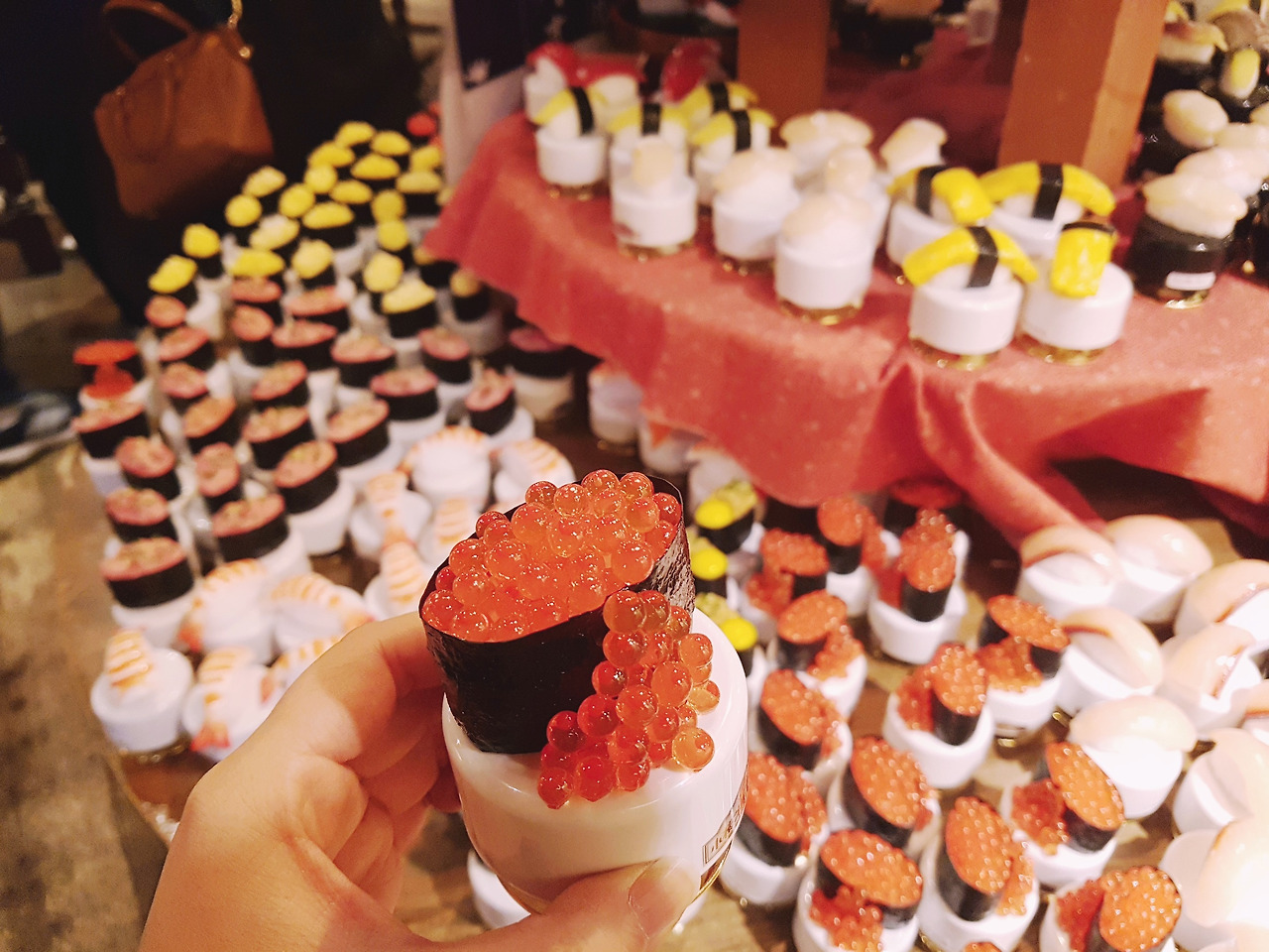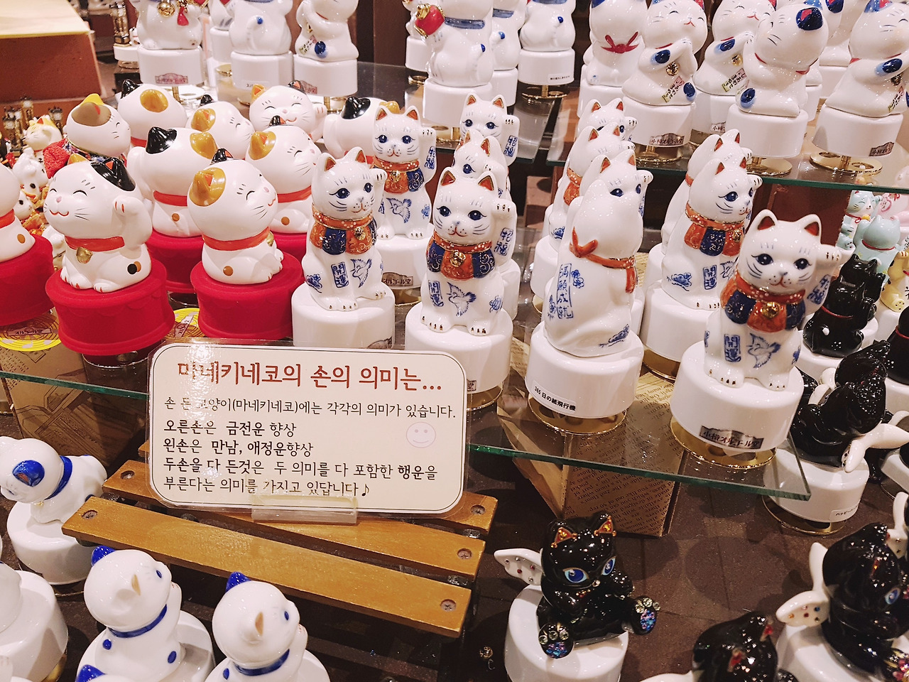 가장 인기가 많은 회전 목마 오르골(왼쪽), 초밥이 멜로디에 맞춰 돌아간다(가운데), 마네키네코가 만세를 하면 금전운과 애정운을 둘 다 부른다(오른쪽)