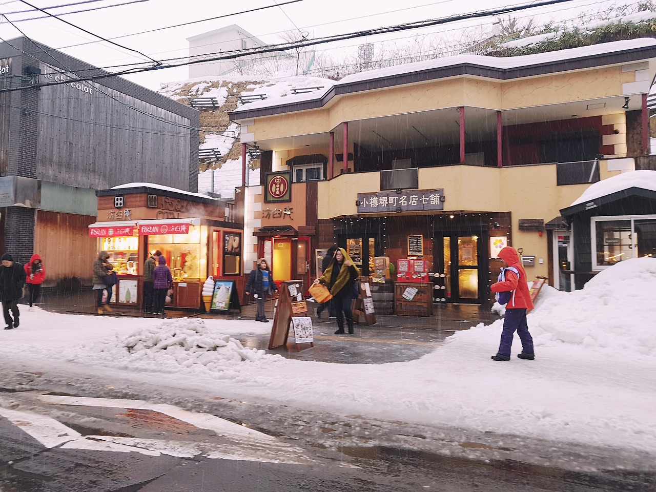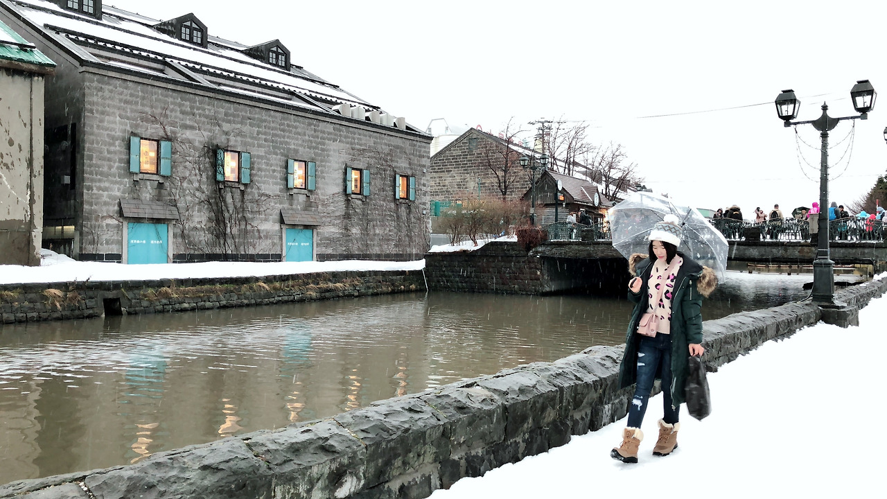 오르골당이 있는 마르헨 교차로는 영화 '러브레터'의 배경이 된 곳이다. 자전거를 타고 가던 후지이 이츠키가 자기 얼굴과 똑 닮은 와타나베 히로코 쪽으로 뒤돌아보는 바로 그 장면의 배경이다. 하지만 현실은 영화가 아니다. 내가 서 있는 마르헨 교차로는 패키지 여행의 가이드가 허락한 시간 동안 오르골당 앞에서 사진도 여러 장 찍고 쇼핑도 좀 해야 하는 한국인들 천지였다. 깨진 감성을 애써 붙들어 쥐고 한숨을 쉬는 사이, 눈발이 날리기 시작했다. 진눈깨비 비슷하게 얼다가 만 비같기도 했는데, 점점 거세지는 것 같아 불안한 마음을 숨기고 얼른 오르골당 안으로 들어갔다. 3층 짜리 목조 건물에, 1층이 제일 넓고 가운데가 높은 천장까지 뚫려 있는 구조였다. 아주 어렸을 때 뚜껑을 열면 음악 소리가 나는 보석함을 받았던 적이 있는데, 그때 빼고는 오르골이란 것에는 관심을 가져본 적이 없었던 나로서는 건물 전체에 가득 찬 각양각색의 오르골들이 꽤 신기했다. 이것저것 돌려도보고 열어도 보고 한동안 집중해서 구경을 했는데, 가격이 어마무시해서 지름신은 오지 않았...던 것 같지만 결국 적당한 가격의 회전목마 오르골을 하나 샀다. 회전목마를 돌리면 '미녀와 야수' 멜로디가 흘러나오는 오르골이었는데, 망가지지 않게 포장해달라고 줄 서 있느라 오르골당에서 꽤 긴 시간을 보냈다. 그런데도 여전히 진눈깨비는 잠잠해질 기미를 보이지 않았다. 웬만한 눈은 그냥 맞아주겠다며 쓰고 간 털모자가 축축해질대로 축축해졌을 때쯤, 결국 로손 편의점에서 제일 싼 우산을 사들었다. 오르골당에서 나와 오타루 운하까지 사아키마치 거리를 걷다보면 양옆으로 르타오 본점과 롯카테이를 비롯해 아기자기한 소품 공방들, 유리공예품 상점들이 줄지어 있다. 르타오는 프랑스 디저트를 너무나 사랑하는 오타루 사람들이 오타루를 거꾸로읽어서 붙인 과자점 이름이라고 한다. 친절하게도 시식할 수 있는 케이크와 과자가 많아 사지는 않았다. (그렇지만 시식하면서 느낀 중독성 있는 맛 때문에 결국 면세점에서 르타오 치즈쿠키를 사오고 말았다.) 유리공예품 상점에는 정말 유리로 만든 게 맞는 건가 싶을 정도로 작고 아기자기한 생활장식품에서부터 큼지막한 예술 작품까지 구경할 게 넘쳐 났지만, 한두 개 상점을 열심히 둘러보고 나면 계속 비슷한 물건들의 반복이어서 나중에는 무심히 지나치게 된다. 쉽게 살 수 없는 가격의 유리공예품들은 어쩐지 거기에 그렇게 모여있어야 가장 예쁠 것 같다는 생각이 들어 돈 주고 집에 데려오고 싶지가 않았다. 전부 나같은 생각을 하면 장인들의 생계가 어려워질 것 같아 걱정스러웠지만, 전부 나같지는 않으니 다행이라고 생각했다. 사실 사카이마치 거리는 길거리 음식으로 유명한 곳인데, 이 날은 진눈깨비에 바람이 계속 부는 바람에 안 미끄러지고 무사히 걷는 데 집중해야 하는 상황이어서 뭘 사먹을 수가 없었다. 그렇게 사카이마치 거리를 지나 오타루 운하쯤 다다르니 눈발이 잠시 약해졌다. 어찌나 반가운지, 최소한 여기서는 편히 걸으면서 사진도 좀 찍으라고 허락받은 기분이었다.