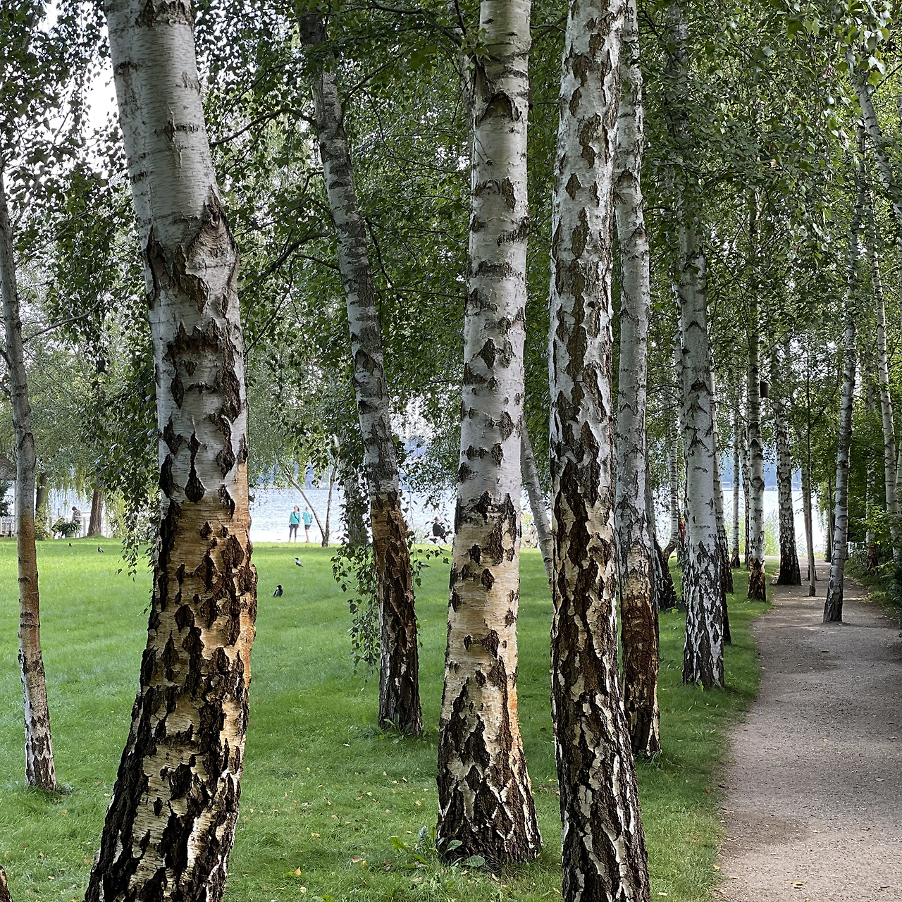 호수 위에 반짝이는 햇살, 길게 서 있는 자작나무, 커피와 케이크를 먹으며 행복한 얼굴로 대화를 나누는 사람들.