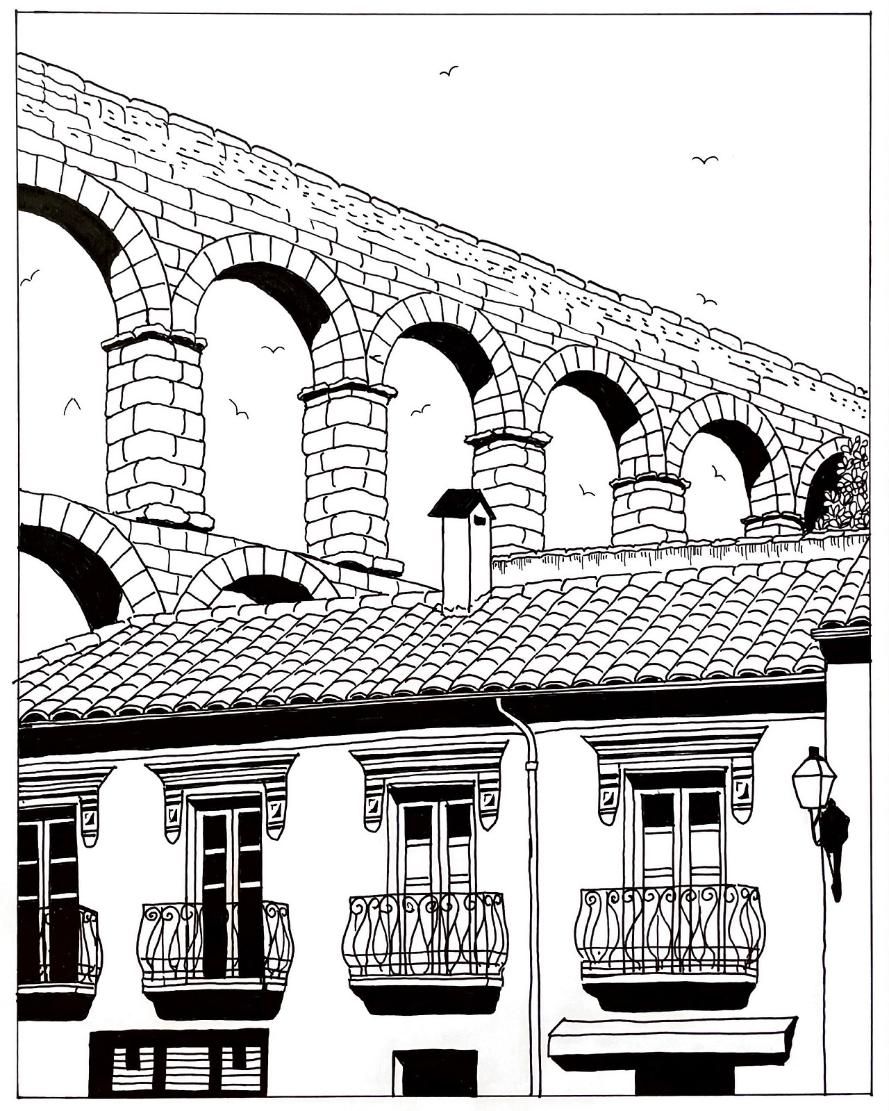 이번 드로잉에서는 수도교의 전체 모습을 담지는 않았다. 아주 인상적인 장면이기 때문에 이미 많은 분들이 그리셨을 것 같기 때문이다. 그래서 나는 주택가 바로 위로 수도교가 지나가는 끝자락의 풍경을 그려보았다. 그리기에 더 수월해 보여서 이 장면을 그린 이유도 있다.