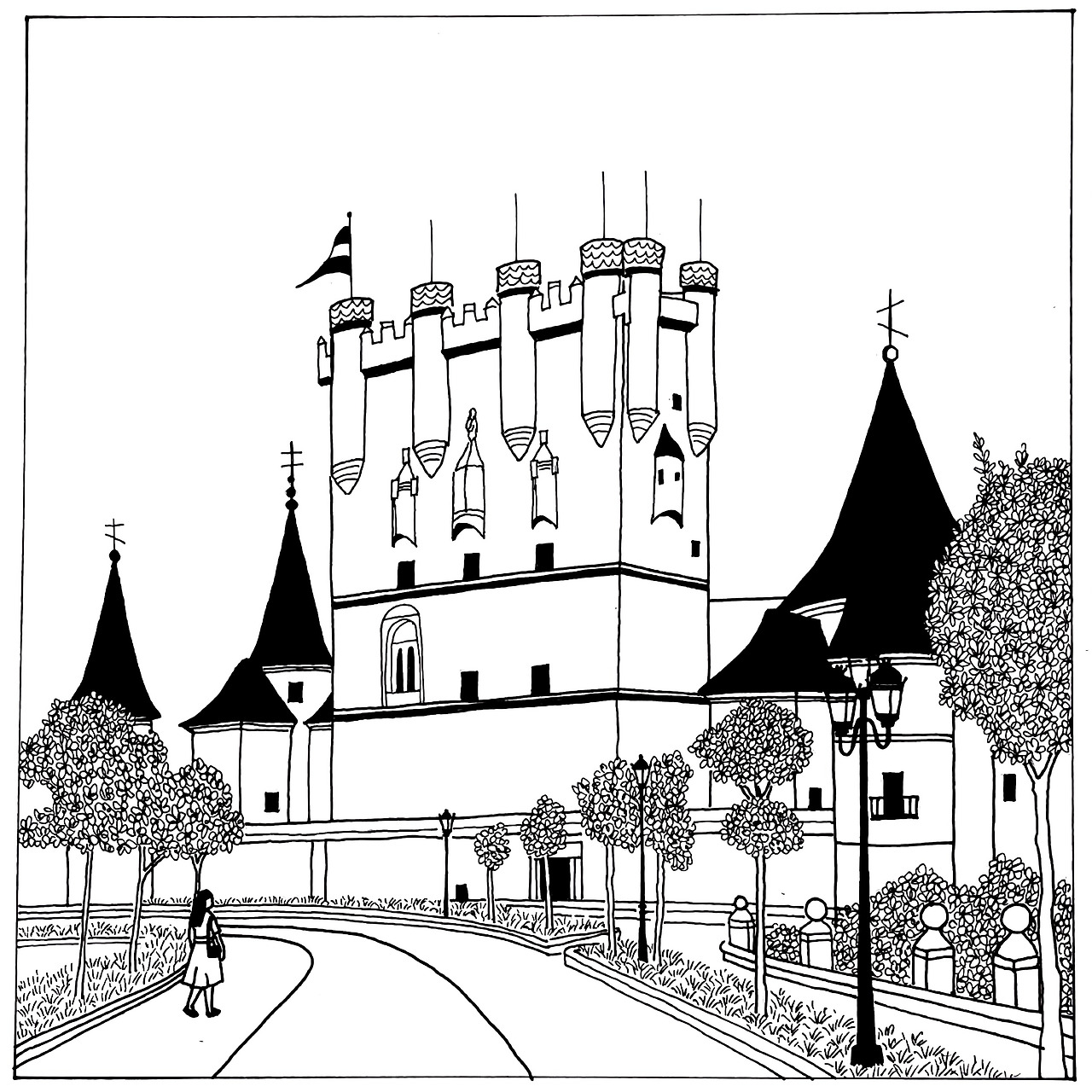 참, 이번 그림에서는 성의 전체적인 모습을 단순화해 담아보았다. 실제 건물은 더 복잡하고 장식도 많지만 이번엔 깔끔하게 마무리하고 싶었다. 왼쪽 아래에는 성 쪽으로 걸어가는 사람 한 명을 그려넣었는데, 보는 사람도 그 길을 따라 알카사르로 들어가는 기분을 느꼈으면 좋겠다는 마음에서였다.
