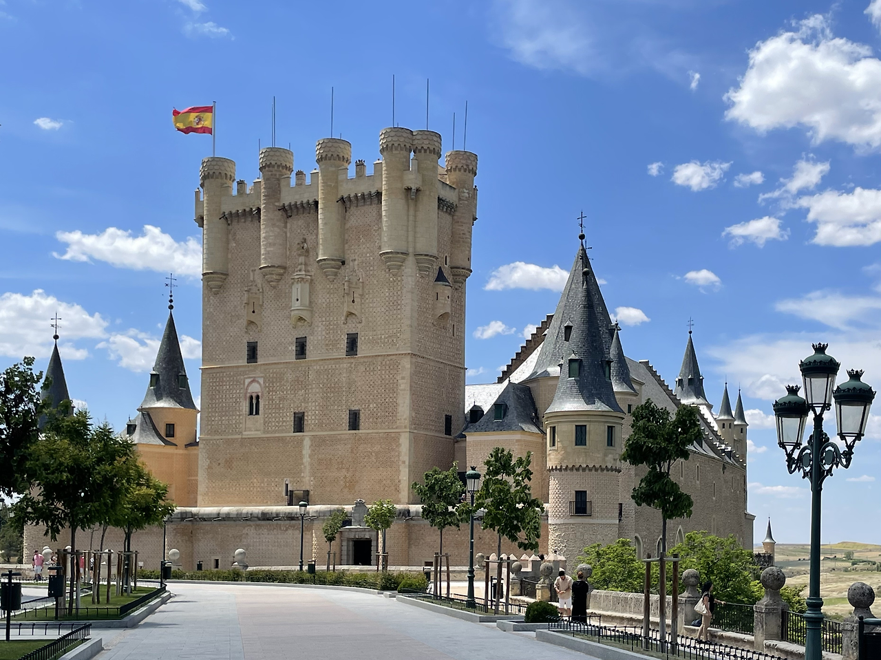 수도교를 둘러본 뒤, 우리는 세고비아 알카사르로 향했다. 알카사르(Alcázar)는 아랍어 Al-Qasr에서 유래한 말로 성이나 궁전을 뜻한다. 이 성이 유명한 데에는 여러가지 이유가 있지만, 그중 하나는 디즈니 <백설공주> 속 성이 바로 이곳을 모델로 했다는 점이다. 멀리서 보니 과연 뾰족한 첩탑과 지붕, 요철 모양의 성벽까지, 딱 동화 속 공주가 살 법한 곳처럼 보였다.