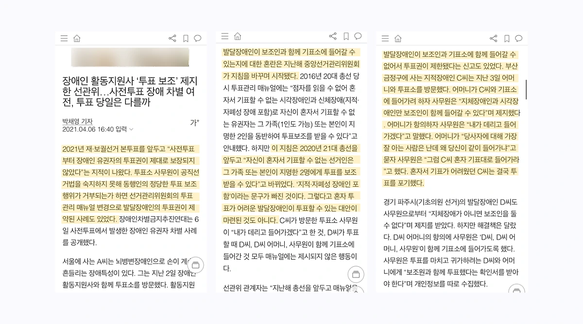 서울에 사는 A 씨는 뇌 병변 장애인으로 손이 계속 흔들리는 장애 특성이 있다. 그는 지난 2일 활동 지원사와 함께 투표소를 방문했다. 활동 지원사가 투표를 돕기 위해 기표소에 함께 들어가려 했지만 투표소 직원이 막아섰다. 결국 직원은 A 씨를 활동 지원사와 분리시키고 가림막도 없는 탁자에서 기표하게 했다. 이는 '시각 또는 신체장애로 인해 자신이 기표할 수 없는 선거인은 그 가족 또는 본인이 지명한 2인을 동반해 투표를 보조하게 할 수 있다'라는 공직선거법이 지켜지지 않기도 한 사례다.