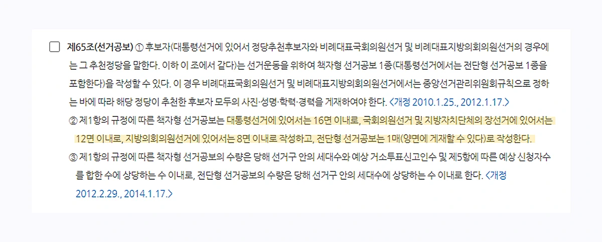 현재 시각장애인에게는 점자형 선거공보물이 제공된다. 하지만 점자 선거공보물은 활자물보다 내용이 부실하다. 이유는 공직선거법 제65조 2의 제1항에서 확인할 수 있다.