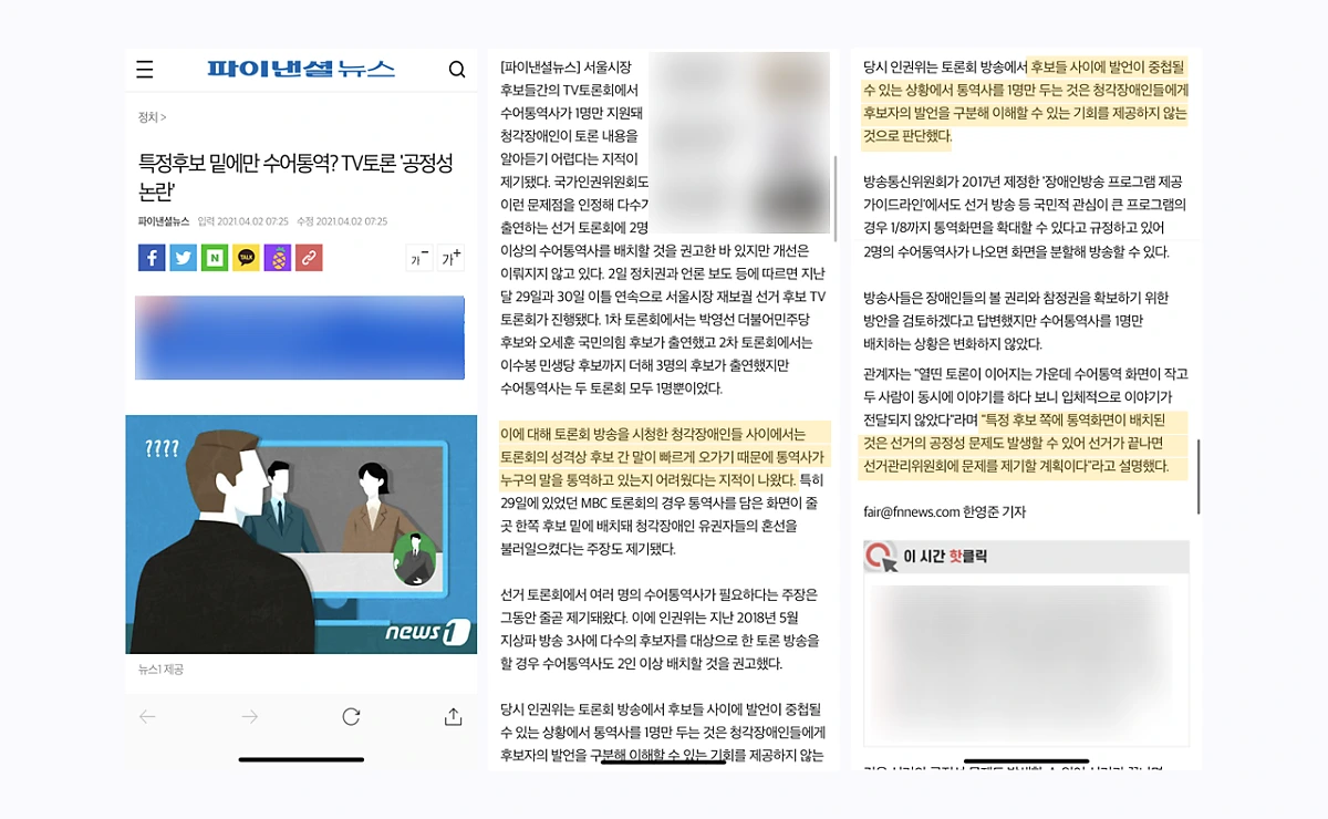 바로 두세 명 이상의 후보자가 나오는 토론회에서는 한 사람이 모든 참석자를 전담해야 하는 문제가 생긴다는 것이다. 그뿐만 아니라 실제로는 수어 통역자의 위치 때문에 특정 후보에 시선이 고정되고, 누구의 발언인지도 모를 수밖에 없던 사례도 확인할 수 있었다.