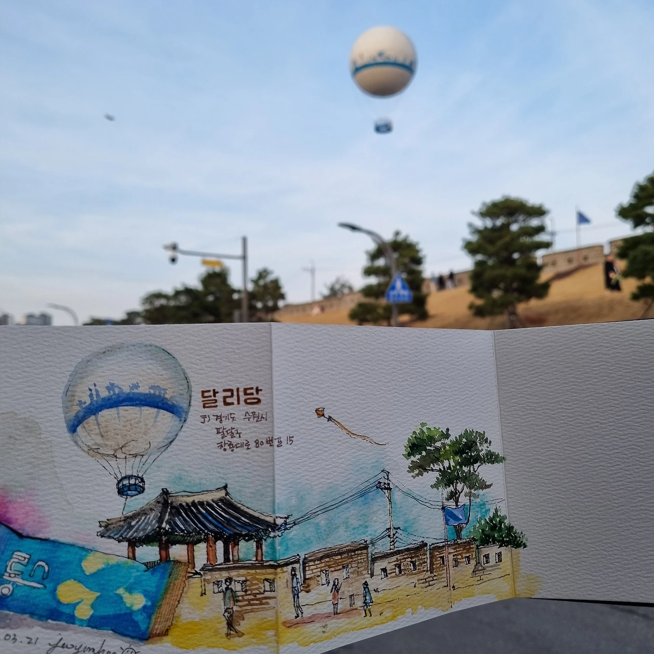 방화수류정은 나들이객들로 붐볐다. 젊은 연인들은 산수유나무 아래 돗자리를 펴고 피크닉을 즐긴다. 손을 잡고 다정히 걷는 노부부, 반려견과 함께 산책 나온 가족, 따스한 햇볕아래서 바람을 타고 연을 날리는 사람들. 모두 봄을 느끼러 나온 모양이었다. 통창이 있는 카페에 앉아 지나가는 사람들도 보고, 진한 향의 커피에 달달한 빵 먹으며, 그림 그리면서 시간을 보내니 ‘이런 게 행복이 아닌가’ 하는 생각이 들었다. 이제 완연한 봄이다.