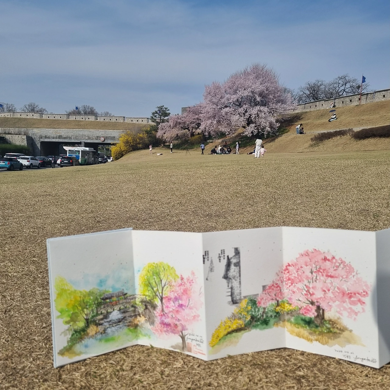 불과 3~4일 전만 해도 산수유만 피어있었는데, 한낯의 기온이 훌쩍 높아지면서 벚꽃들이 활짝 다 폈다. 화홍문이 보이는 다리아래, 왕벚꽃나무가 만개했다고 해서 수원화성으로 향했다. 다음날 비소식이 있어 오늘 안 보러 가면 혹여 꽃잎이 다 떨어질까 부랴부랴 그림도구들을 챙겨 출발했다.