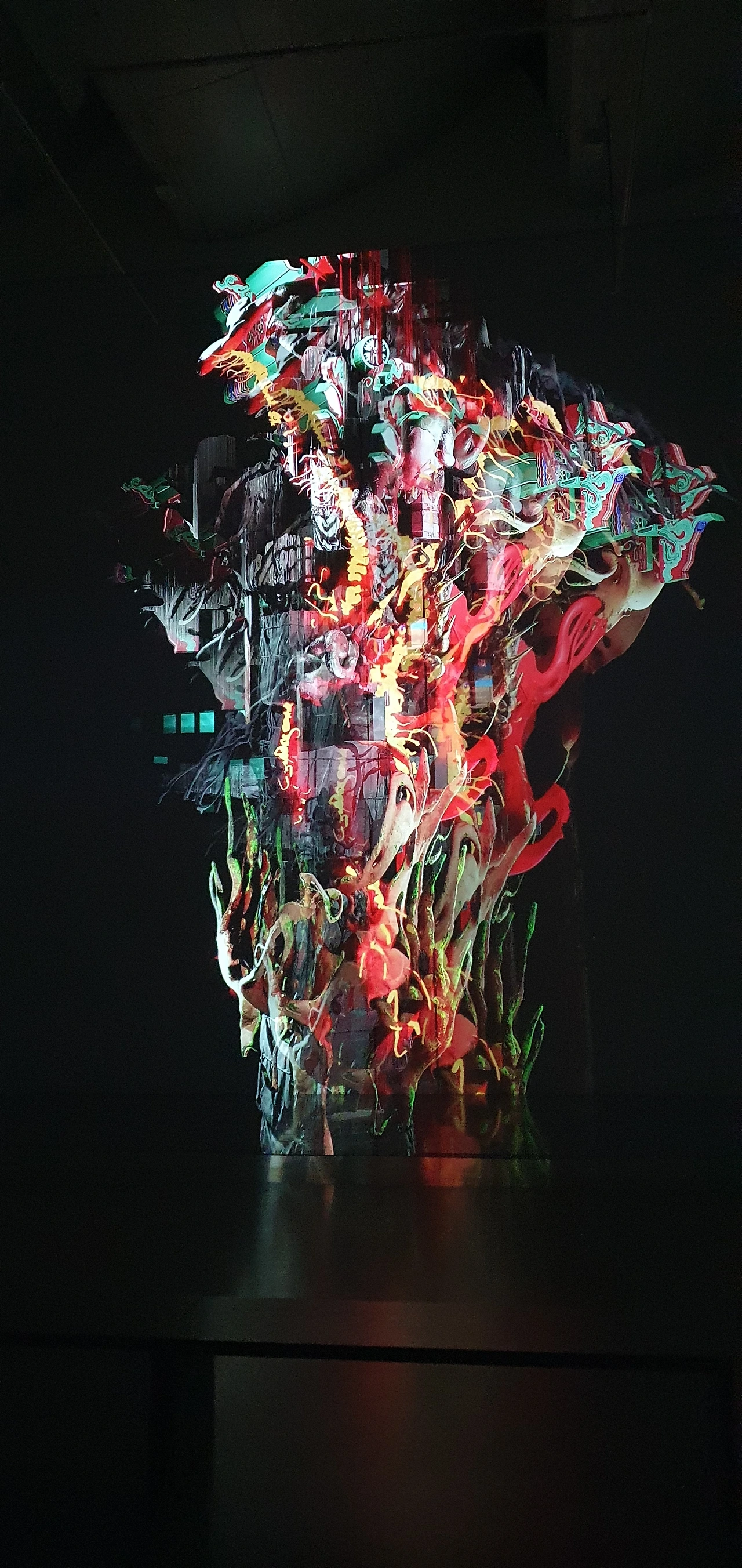 커튼을 걷고 들어서니 못이라는 제목의 큰 스크린이 바닥에 설치되어있고 무어라 설명이 어려운 이미지들이 반복되는데 기괴하기도 하고 어쩜 저런 것을 상상해냈는지 신기하기도 하고 아름답기도 하다.