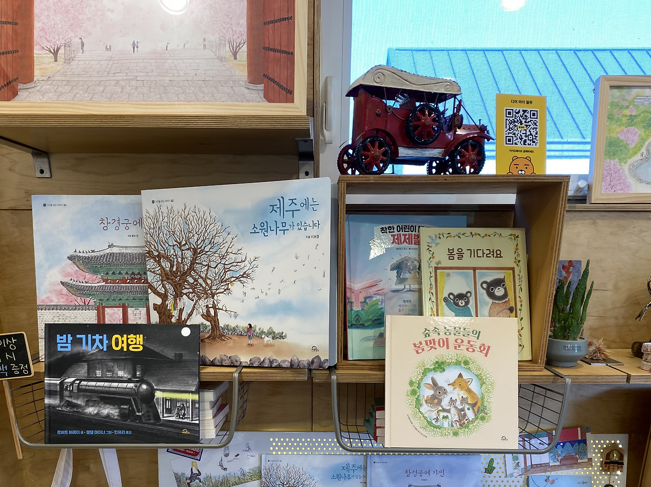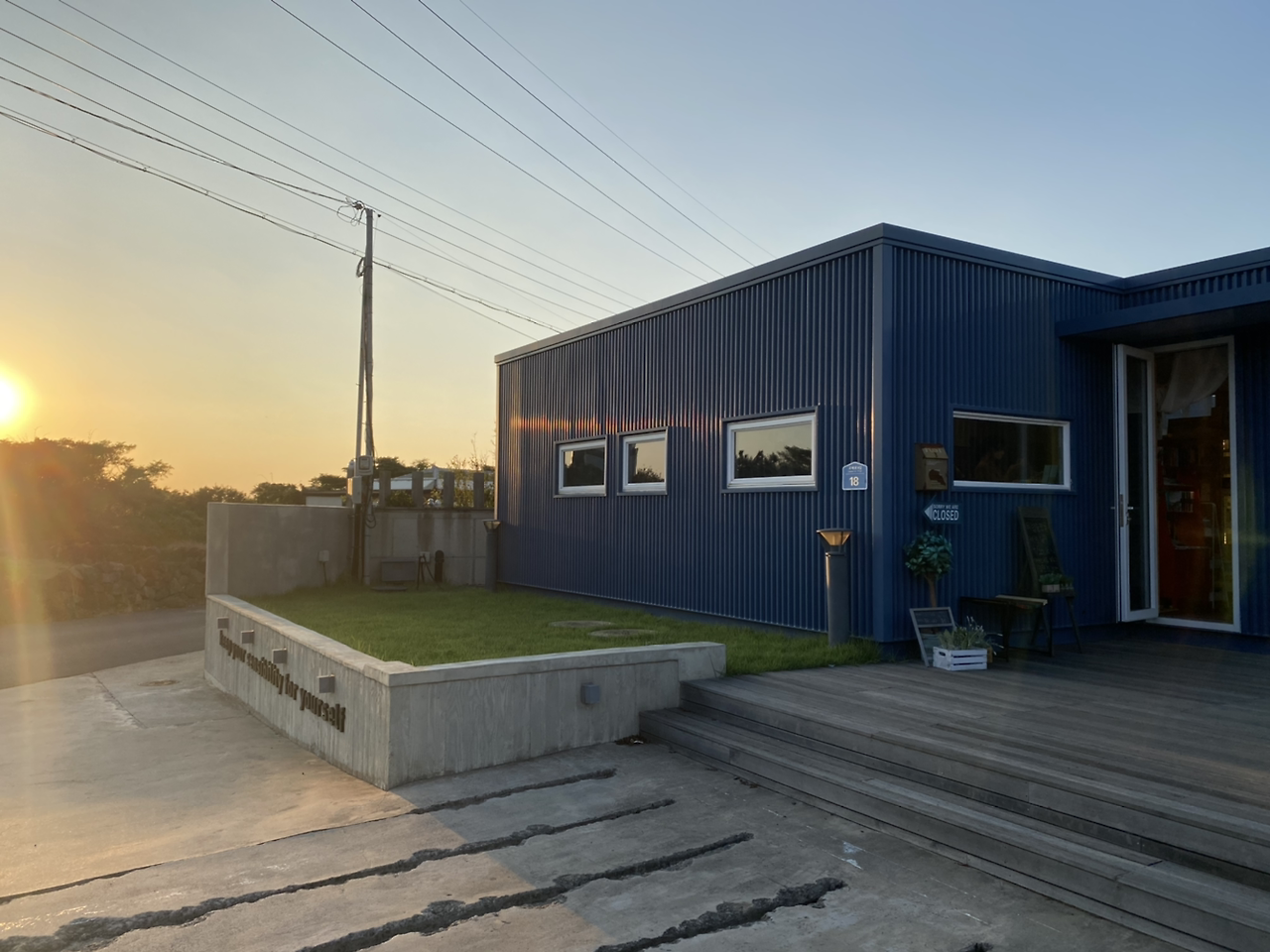 친구의 서점은 꽃가게를 같이 하는 독특한 곳으로 책 냄새와 꽃향기를 동시에 맡을 수 있는 매력적인 곳입니다. 성난 바다나 깊은 하늘에서 볼 수 있는 색으로 건물을 칠해서 더욱 아름다운 곳입니다. 이 서점이 매력적인 이유 중 하나는 책을 이백권 정도만 갖다 놓는데 보고 싶은 책들만 갖다 놓기 때문에 들를 때마다 서너 권 이상 사게 되는 곳입니다. 이번에는 미리 부탁드린 작가님의 책과 함께 제주를 주제로 글 쓰기를 하는 작가님의 책 만들기 강좌도 열리고 마음에 드는 책을 고르다 보니 무려 일곱 권을 사게 됐습니다. 한동안 배가 부를 듯합니다.