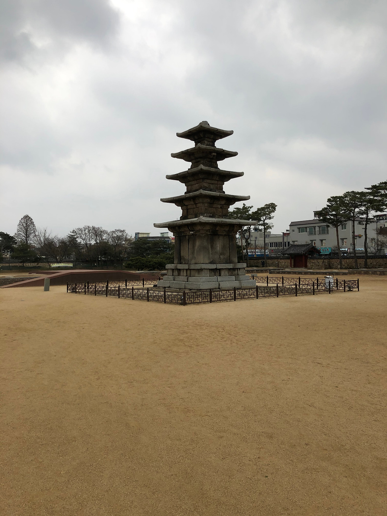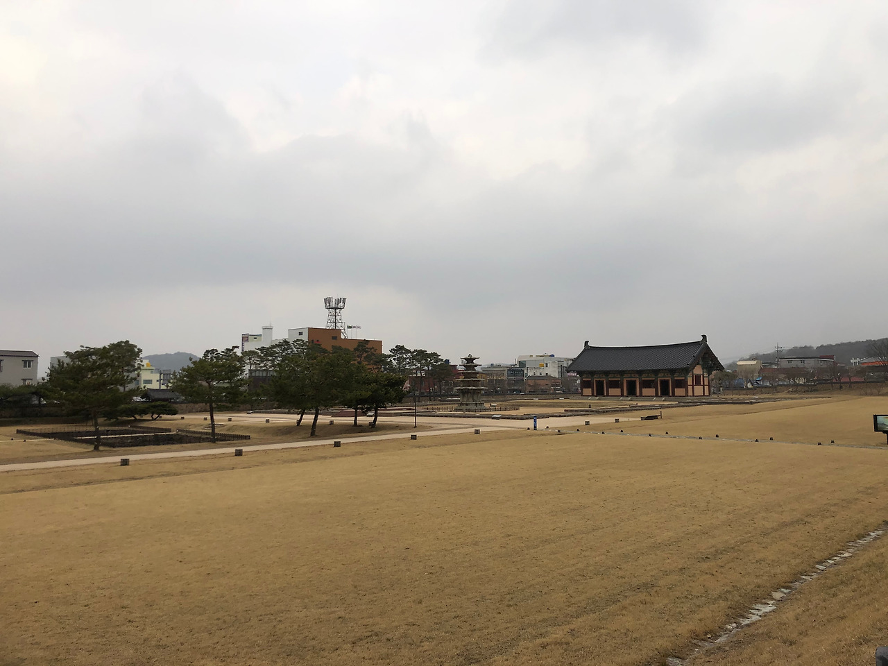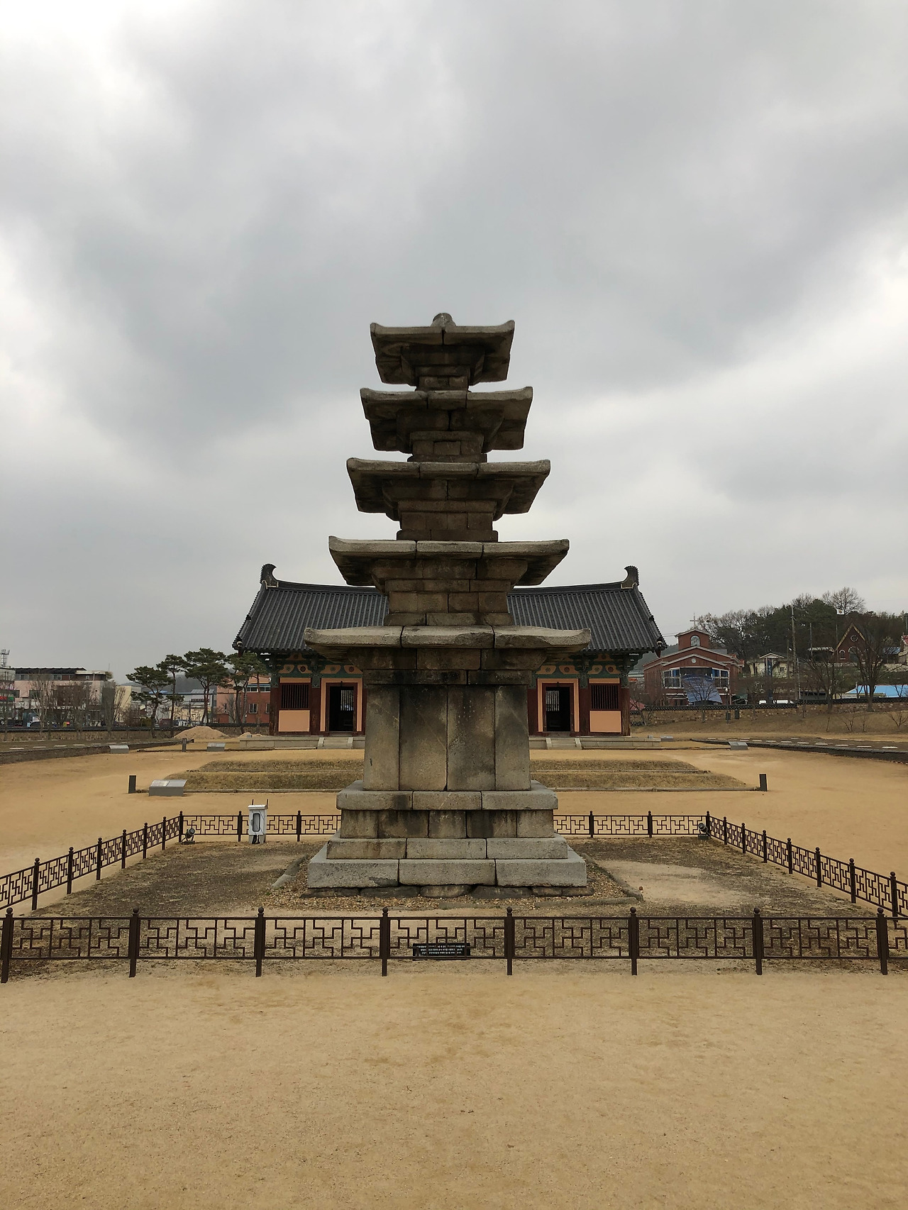 서울에서 6시반에 출발하여 부여에 일찍 도착한 이유가 있었습니다. 정림사지박물관과 국립부여박물관을 관람하기 위해서였습니다. 부여는 처음이었으니 백제의 흔적을 살펴보는 것은 당연지사. 주차장에 차를 세우고 걸어가는데 불길한 마음이 소록소록 생겨납니다. 부여에도 코로나19를 조심하자는 현수막이 많이 걸려있었습니다. 아니나다를까 부여의 박물관들도 모두 휴관 중이었습니다. 거기에 날씨 예보에서는 돌풍이 분다고 조심하라고 할 정도의 날씨였으니 날도 흐려서 비도 올까봐 걱정이 되었습니다. 그래도 산책이라도 하자는 생각에 문을 열고 들어갔더니 엄청난 스캐일의 정림사지가 눈 앞에 펼쳐졌습니다. 복원된 건물은 거의 없어서 휑한 느낌이었지만 건축을 공부한 사람으로서 기둥만 보고도 상상의 건물을 그려볼 수가 있었고, 그 광대하고 사람이 북적북적했을 정림사가 눈에 보이는 듯 했습니다. 정림사지에 정점을 찍은 것이 사람들이 탑돌이를 하고 랜드마크로서 탑 주변에서 만나고 기도 드리는 대상인 오층석탑이 아닐까요. 나무로 지은 다른 건물들은 사라지고 돌로 만든 석탑만 남아 있으니 인생무상이네요.