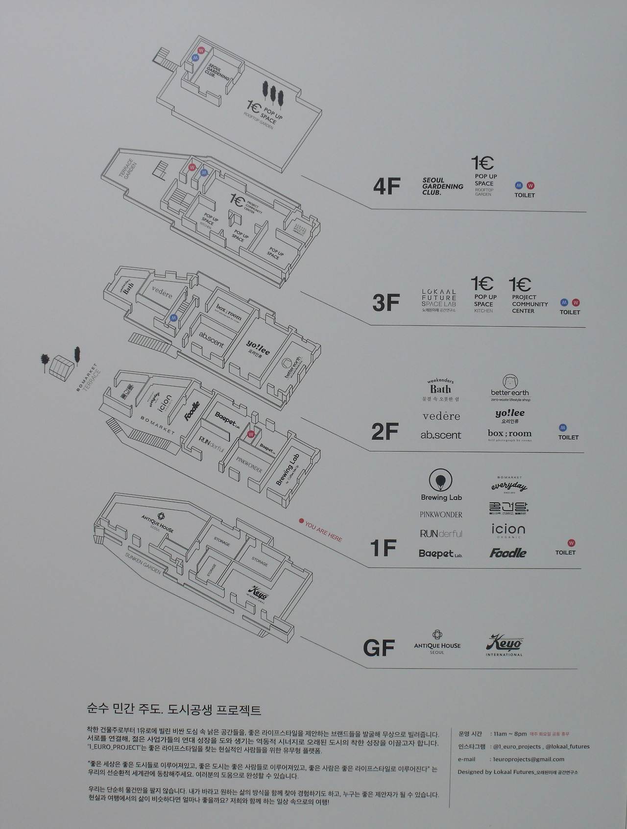 18개라는 브랜드가 하나의 건물에 들어선다고 해서 처음에 많이 놀랐습니다. 직접 보고나서는 건물을 알차게 사용하고 있다는 생각을 하면서도 입주한 브랜드들이 성장하면 멋진 공간을 찾아 나서야겠다는 당연한 생각도 하게 됐습니다. 아마도 이 프로젝트에 기획하고 참여한 모든 분들의 생각일 것입니다.